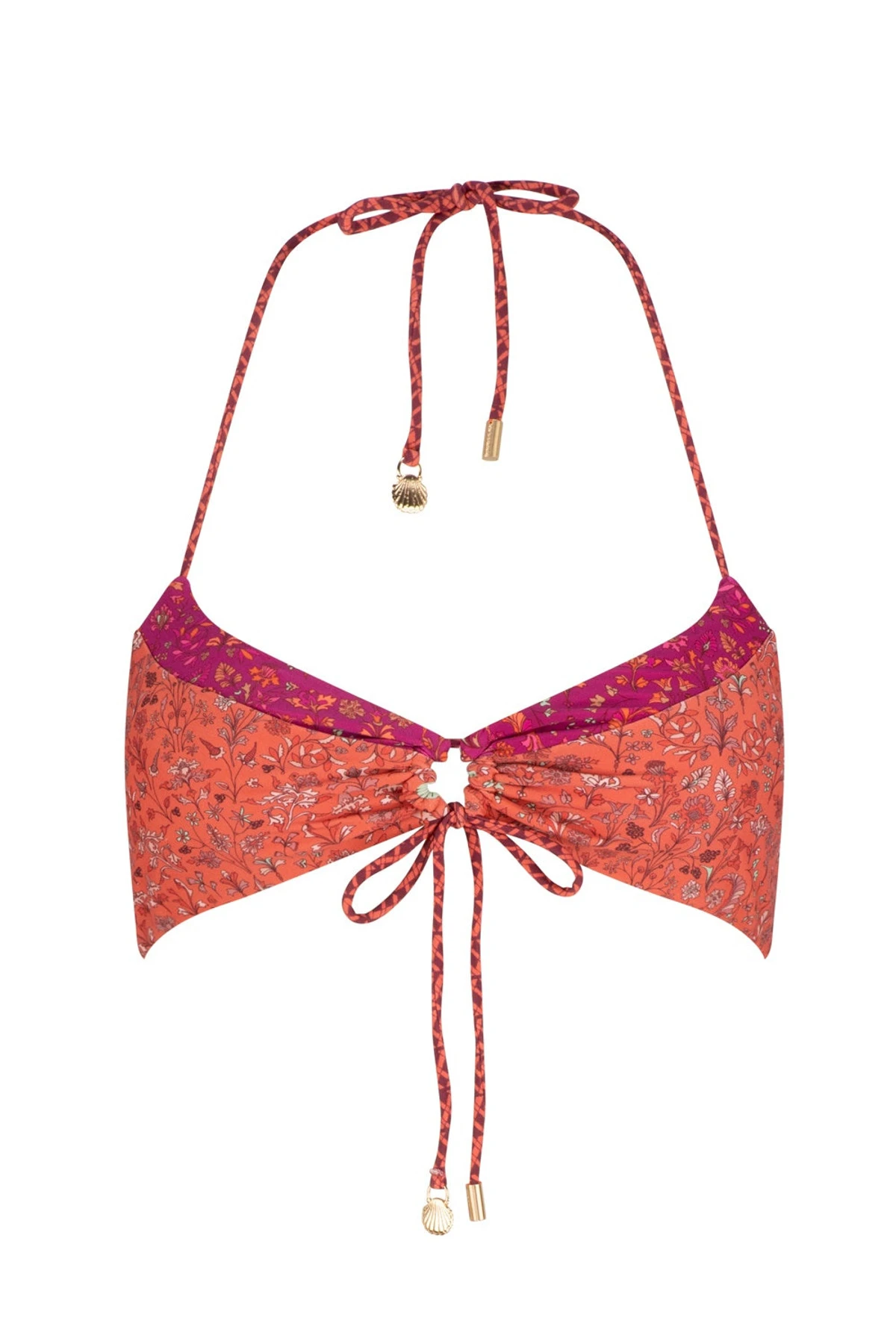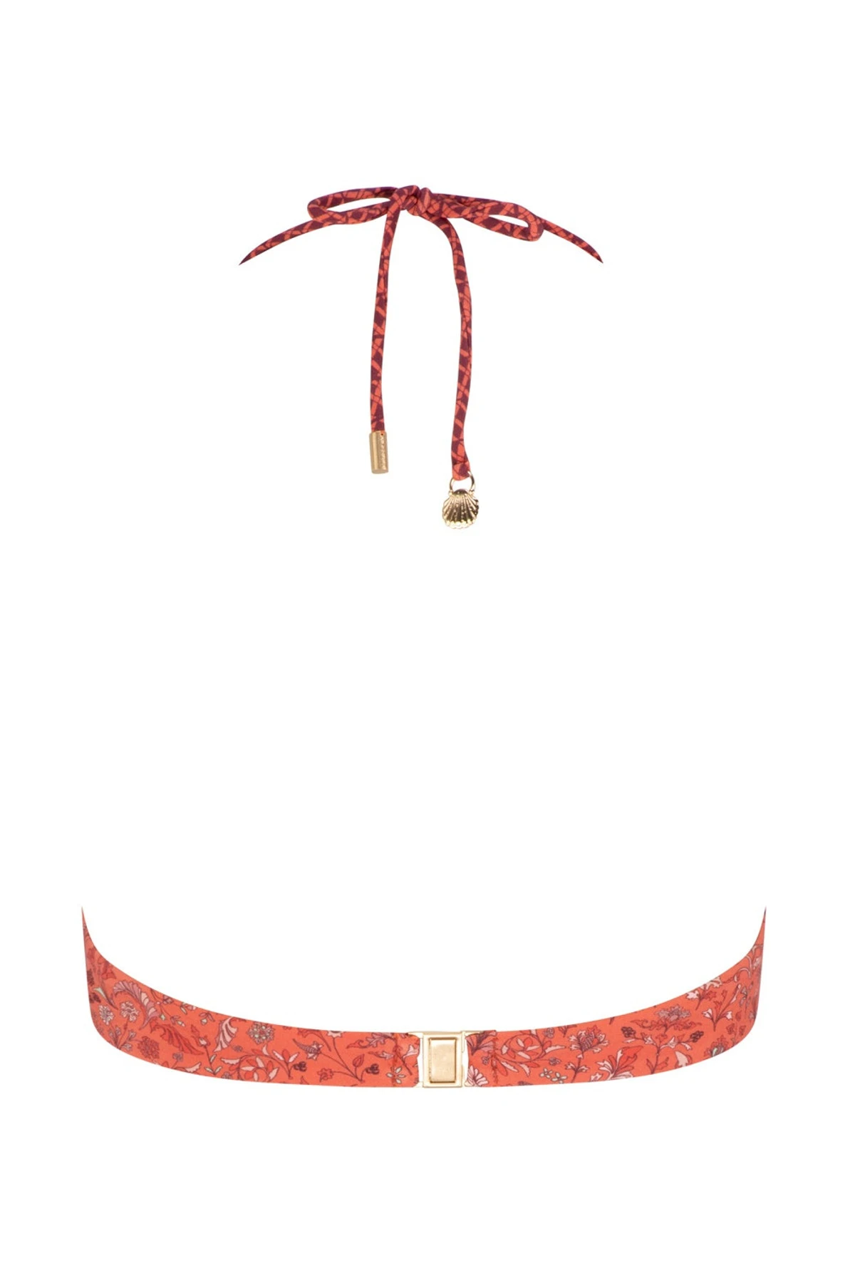 Inspired by intrinsic vintage florals and the elegant artworks of alluring birds, we meet Alexandria. This swim series incorporates new takes on most loved cuts, splicing ditzy florals on bold pink and orange hues for a statement swim style. Make a statement in the Alexandria Maisy V Neck Tri swim top. This premium piece features a stunning raspberry and orange floral design, plus a range of luxurious details including halter style, a ring detail with tie at the front, removable padding, metal clasp at the back, and brushed gold hardware and charms. Elevate your poolside look with this sustainable, fashion-forward piece.
