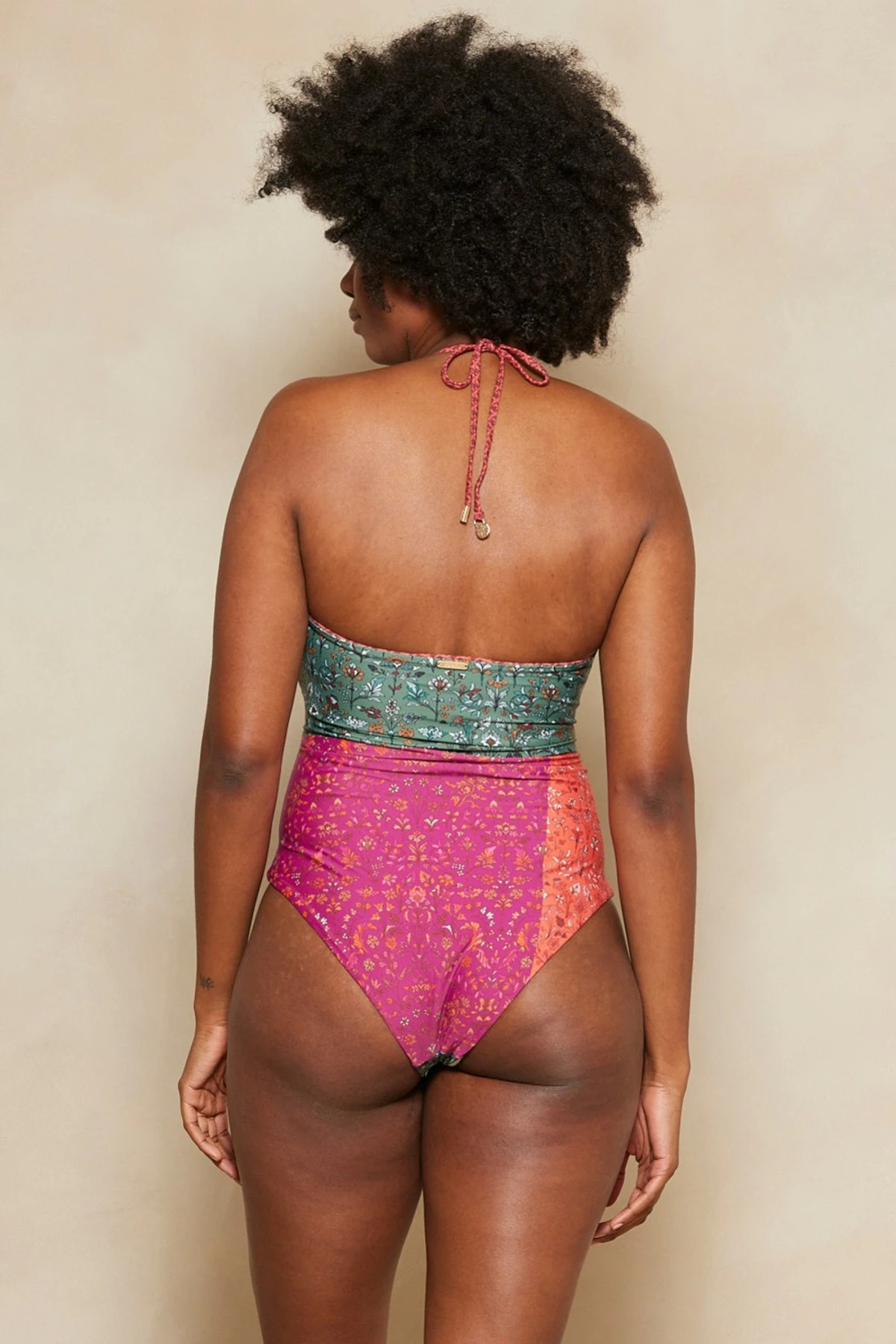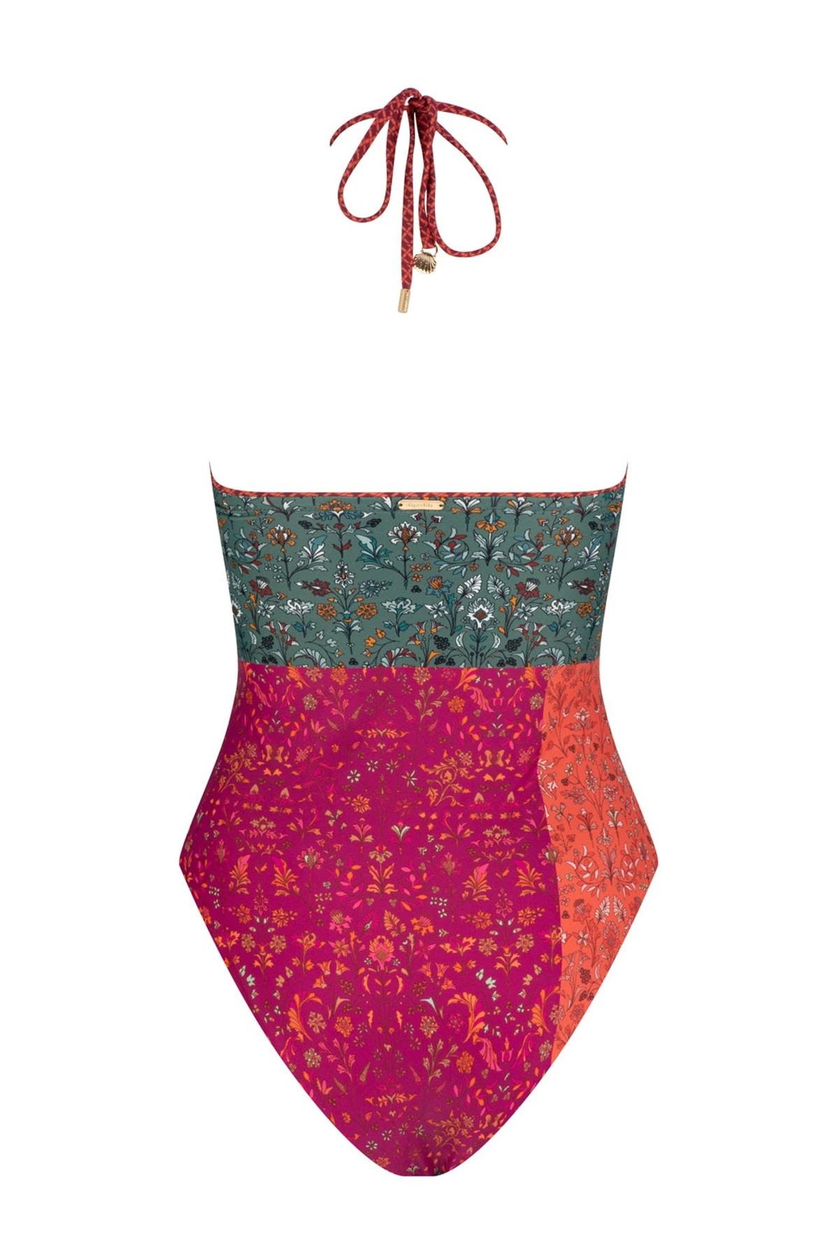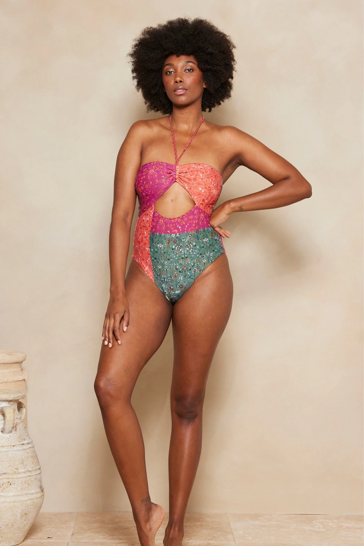 Inspired by intrinsic vintage florals and the elegant artworks of alluring birds, we meet Alexandria. This swim series provides ditzy florals paired with decorative blanket stitching to give a unique and distinct style. Introducing the Alexandria Mia One Piece, a stylish and sustainable swimwear essential. A versatile staple, this stunning suit can be worn as a halter or strapless, with an underbust cutout detail for an extra dose of elegance. Boning at the side seam provides structure, while removable padding offers comfort and convenience. Complete with a classic legline, this floral patchwork one piece is the perfect poolside companion for those seeking a luxurious and exclusive look.