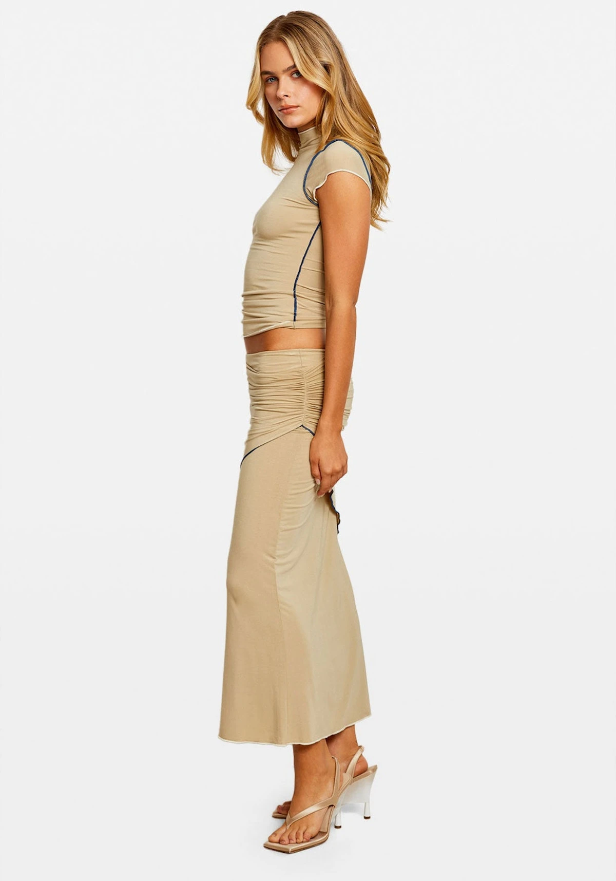 - Ruching at the side seams.