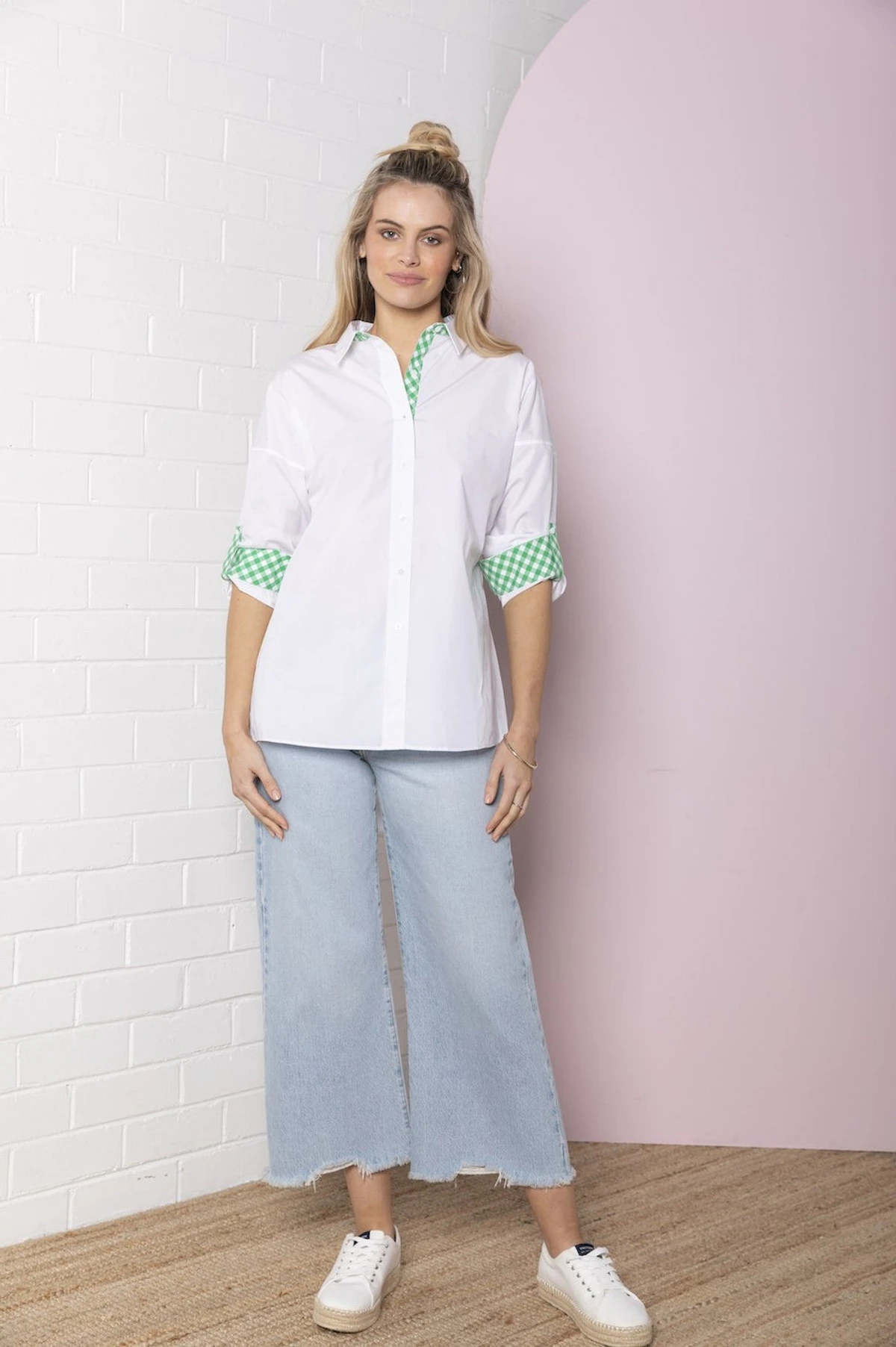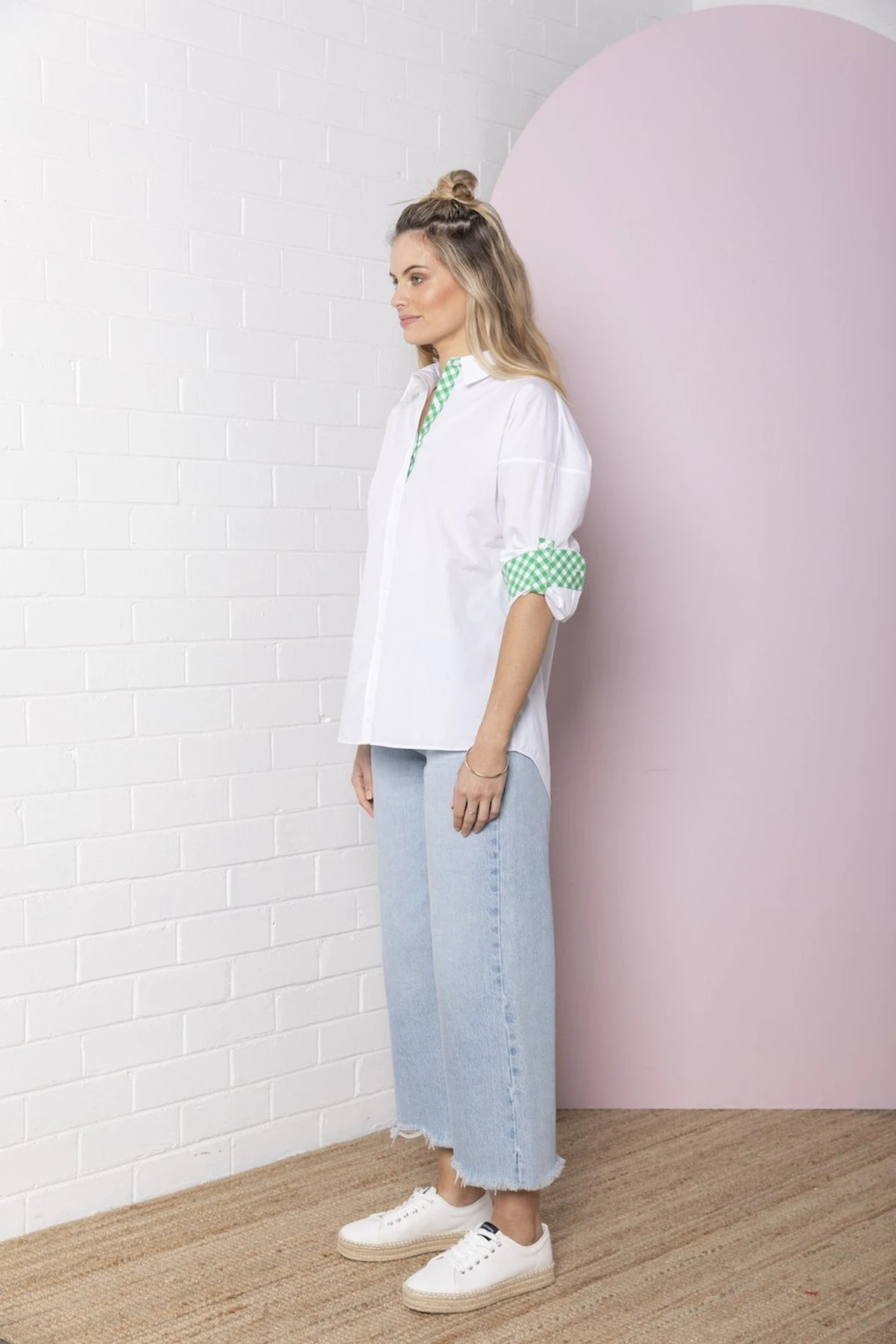 The Classic Oversized Shirt is woven from our 100% pure cotton yarn. This value up shirt is loose fitting and features gingham cuff plackets, bias cut gingham tab tapes and gingham value fastening plackets bring out the emerald look of the shirt. More for you, the classic Bande Studio striped logo under the back of the collar put together this statement piece.