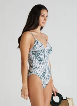 The Ava One Piece, crafted from recycled fabric features a deep V-neck design, comfortable over shoulder straps, an open square back and side tassels.