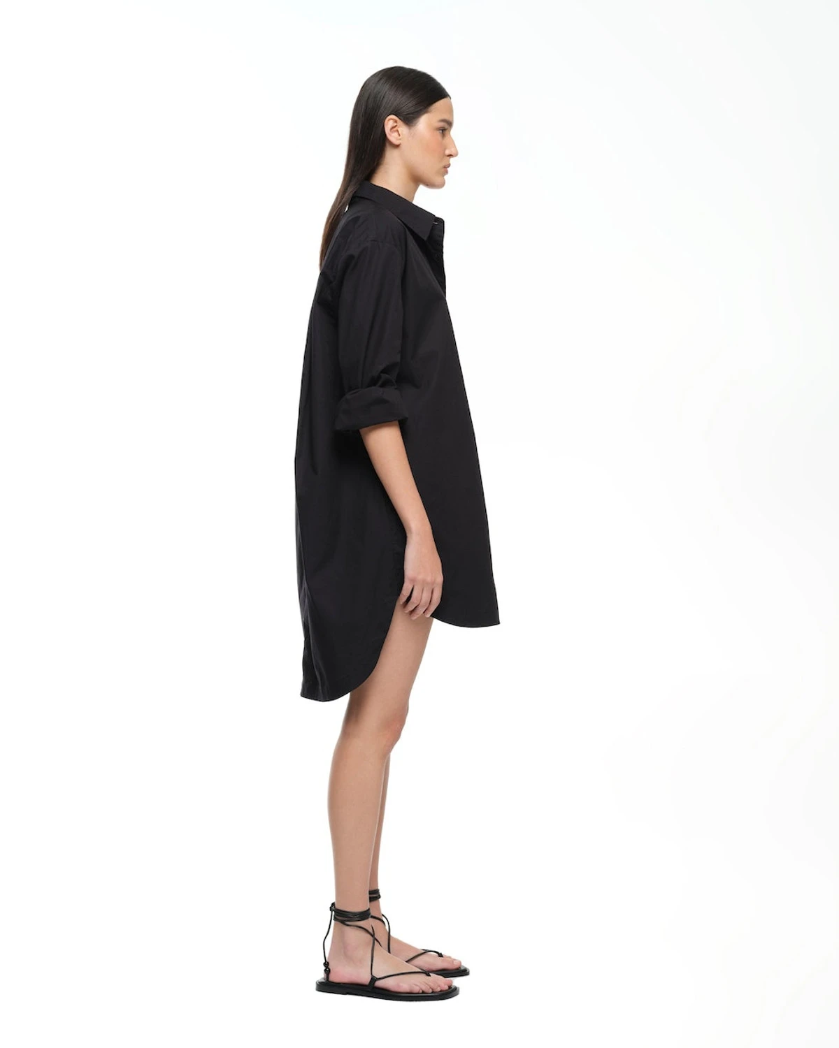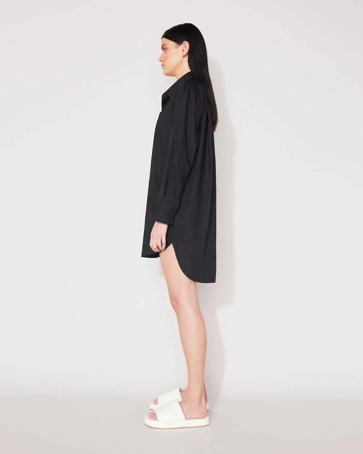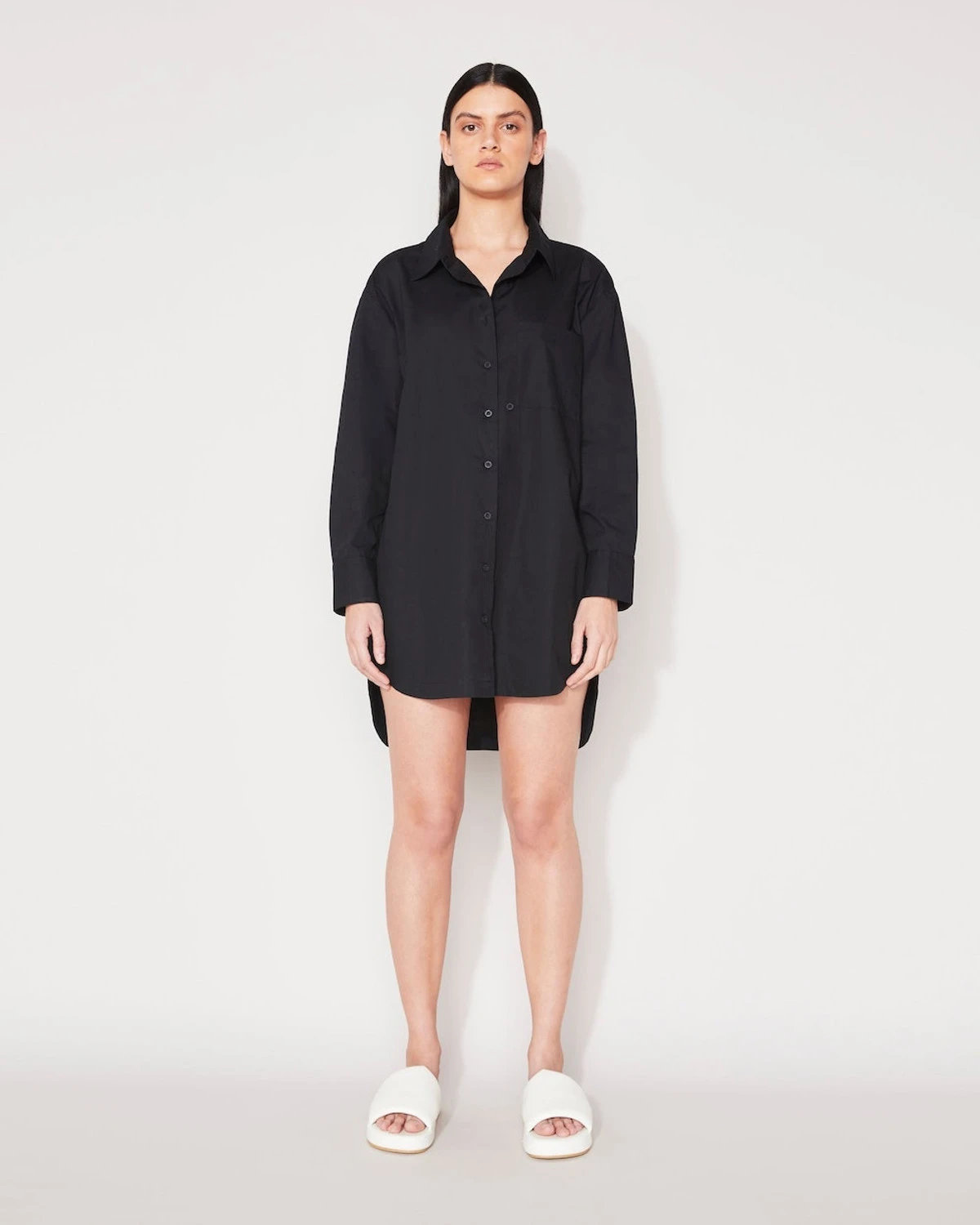 Crafted in a crisp 100% Cotton Poplin with an oversized fit and shaped step hem, the shirt dress is essential to the modern wardrobe. With classic shirt detailing, choose to style it open over jeans and a tank.