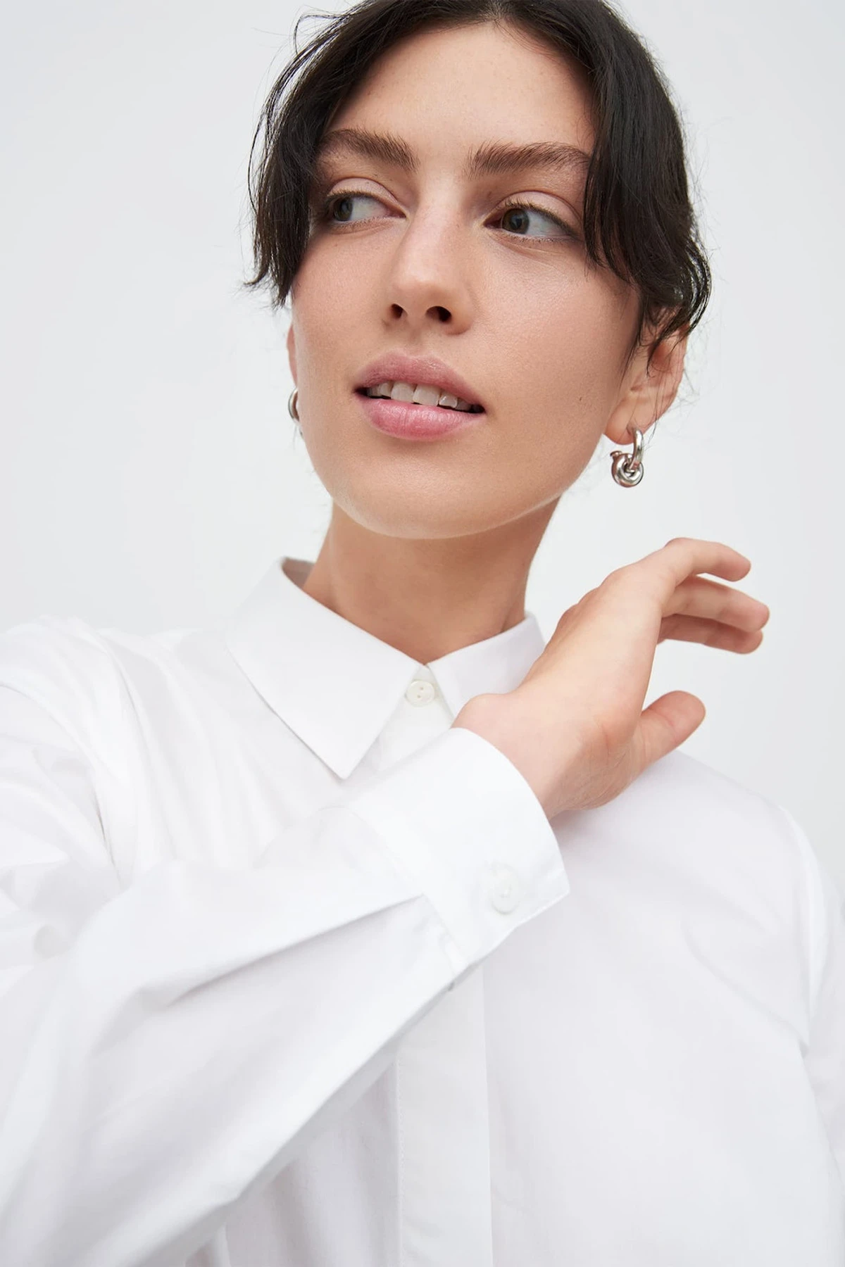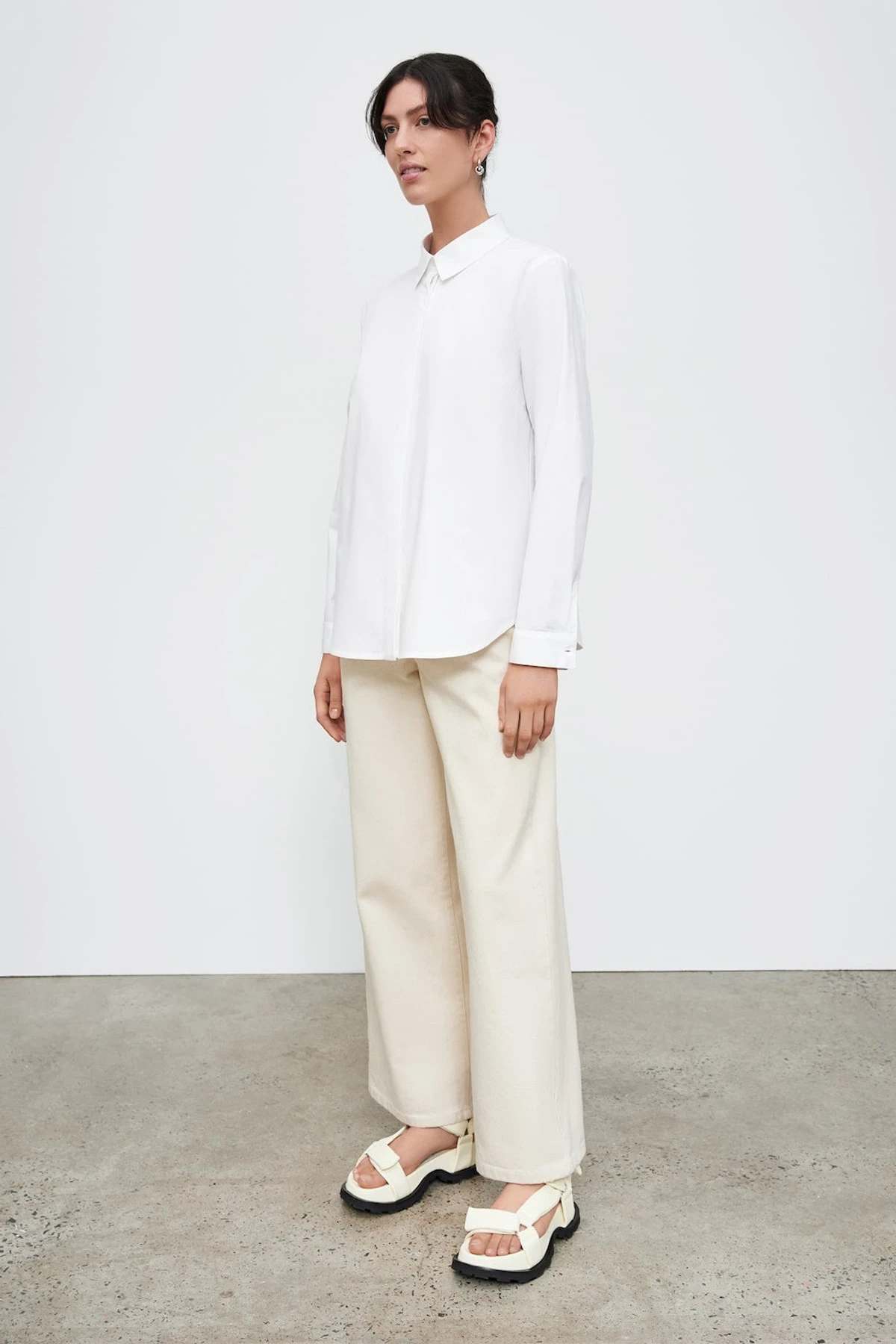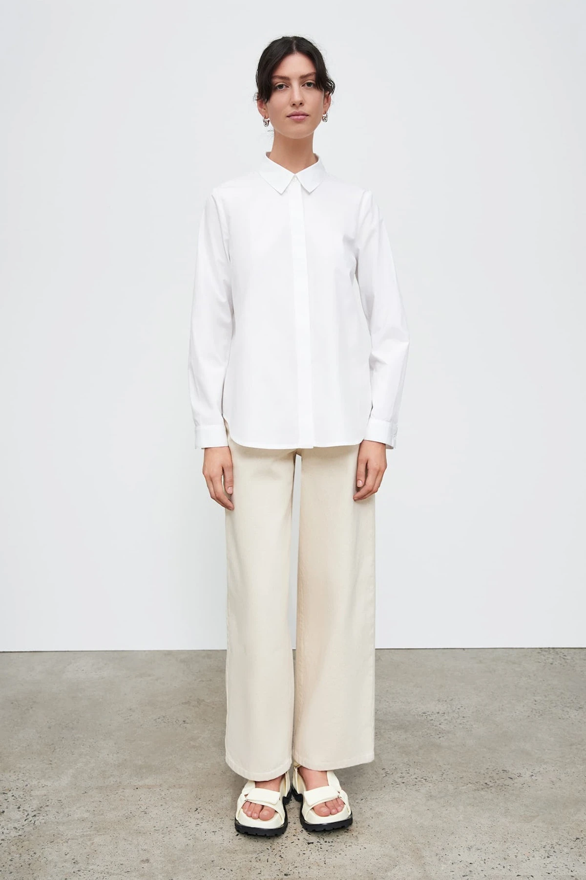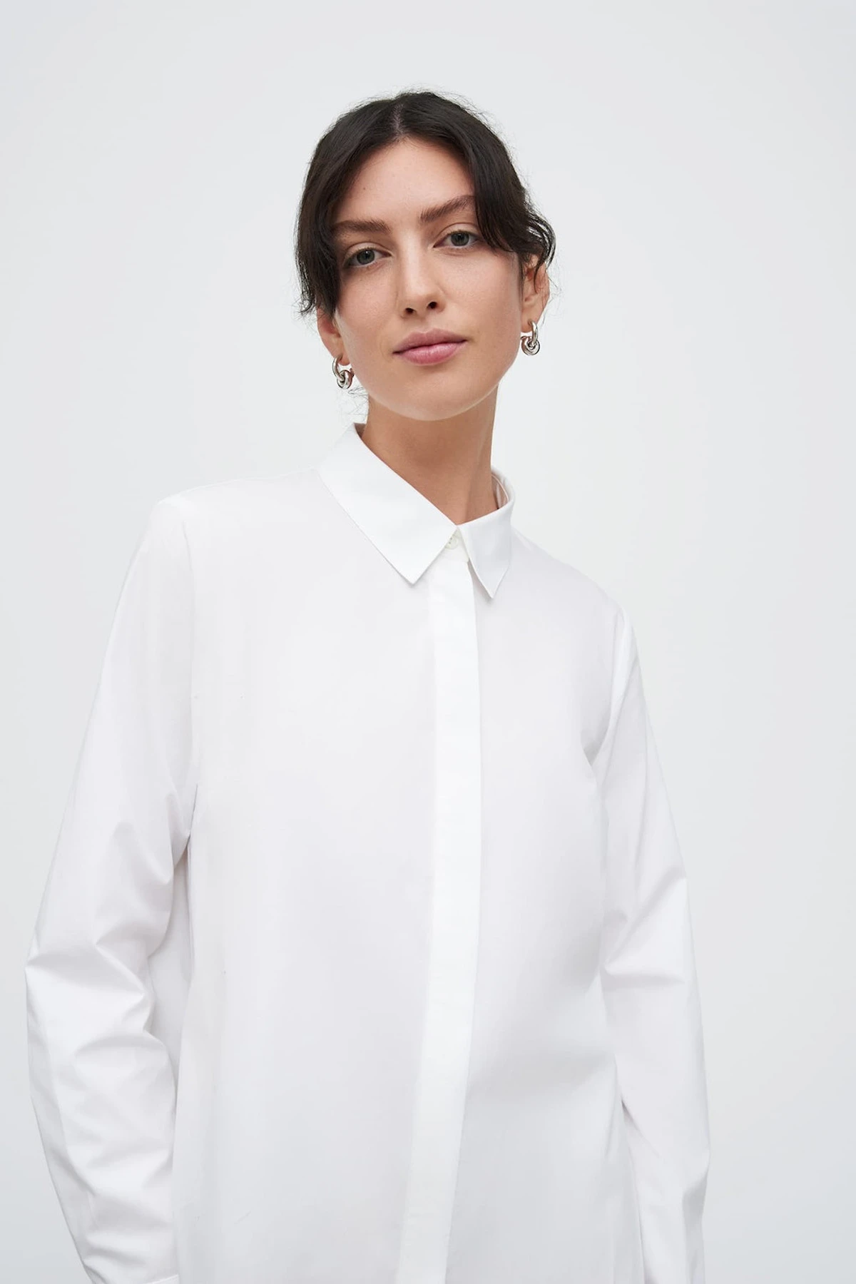 A classic long sleeve shirt made from organic cotton poplin. The shirt fastens with a concealed front value placket and is finished with a curved hem.