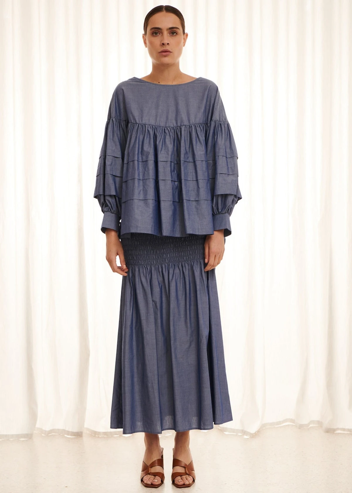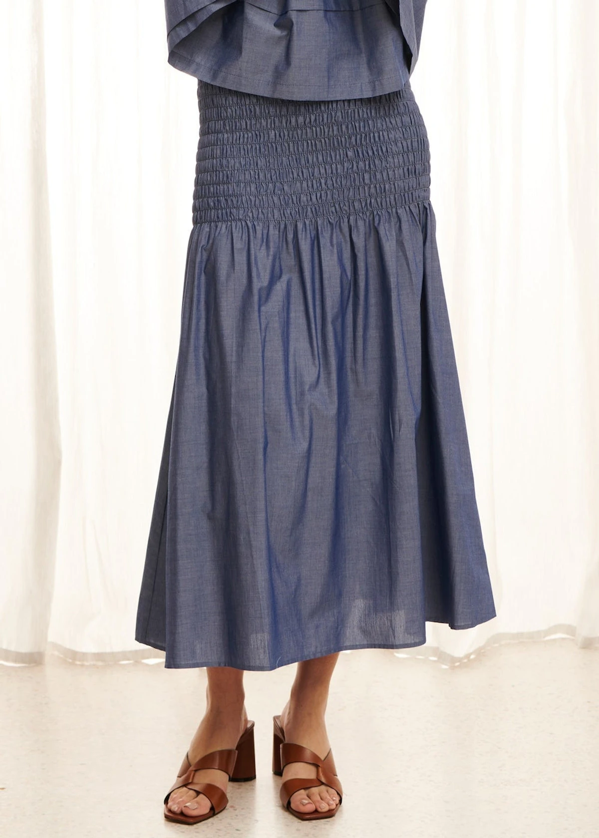 The Faith Skirt is the perfect elevated everyday style, with a soft shirred waistline and a midi silhouette.