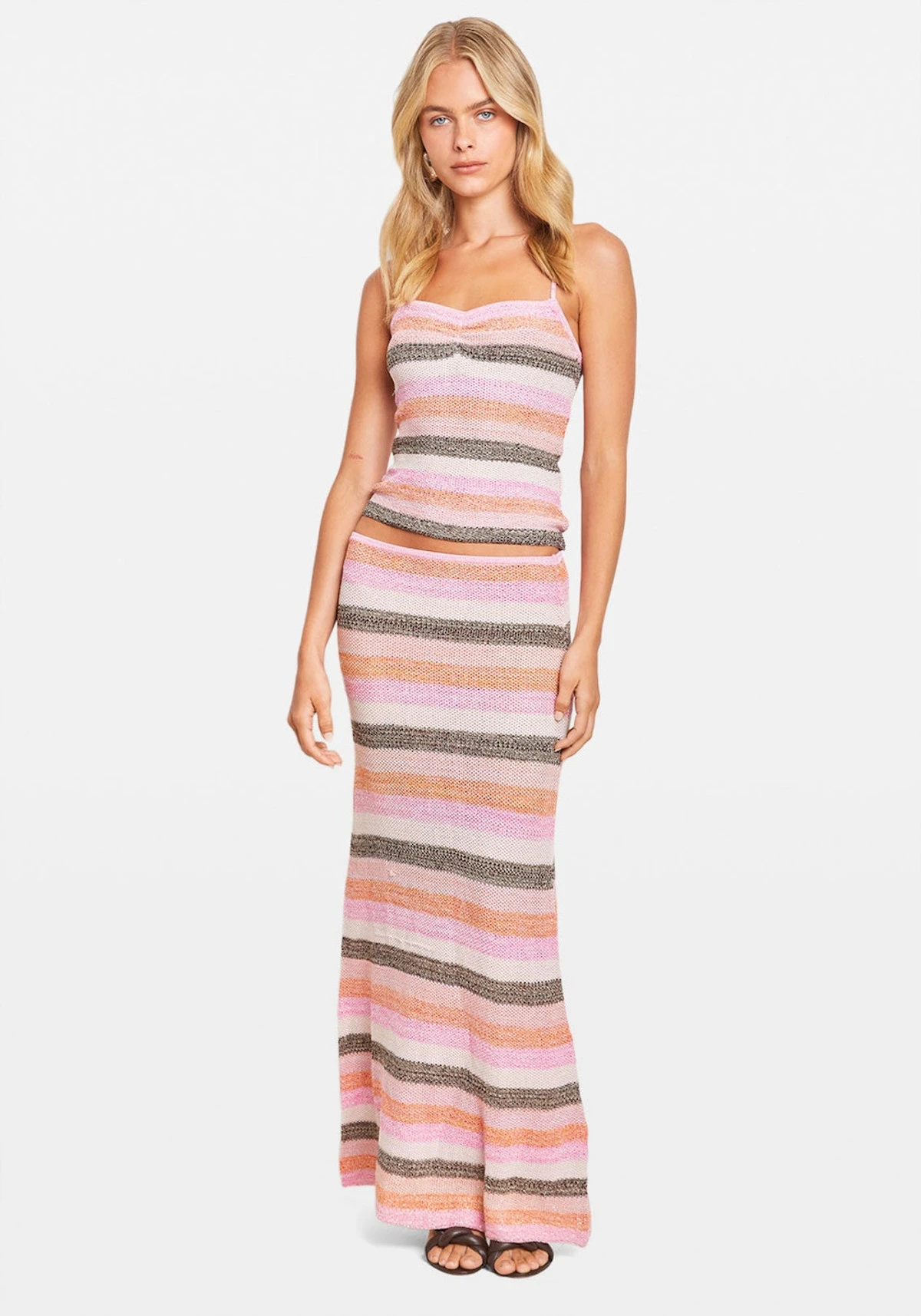 The FIESTA MAXI SKIRT by CHOSEN is made by a true lurex stripe knit, inspired by spanish summer nights. Carefully designed custom stripe knit, inspired by sunset tones. Designed to style back with the FIESTA KNIT TOP.