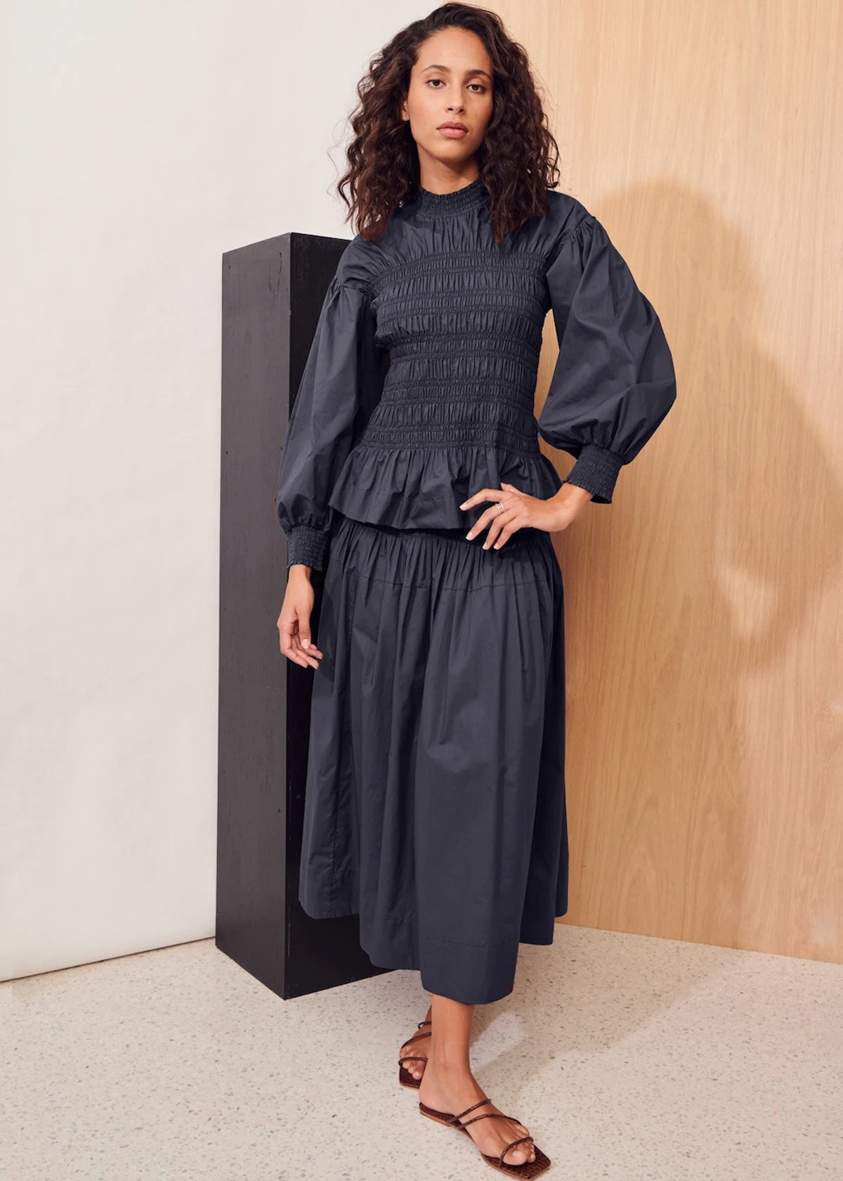 -Shirred waistband and yoke for easy and flattering fit.
