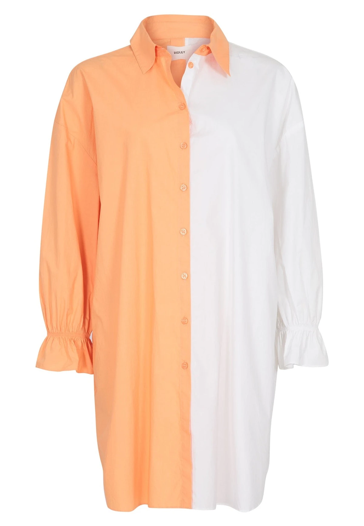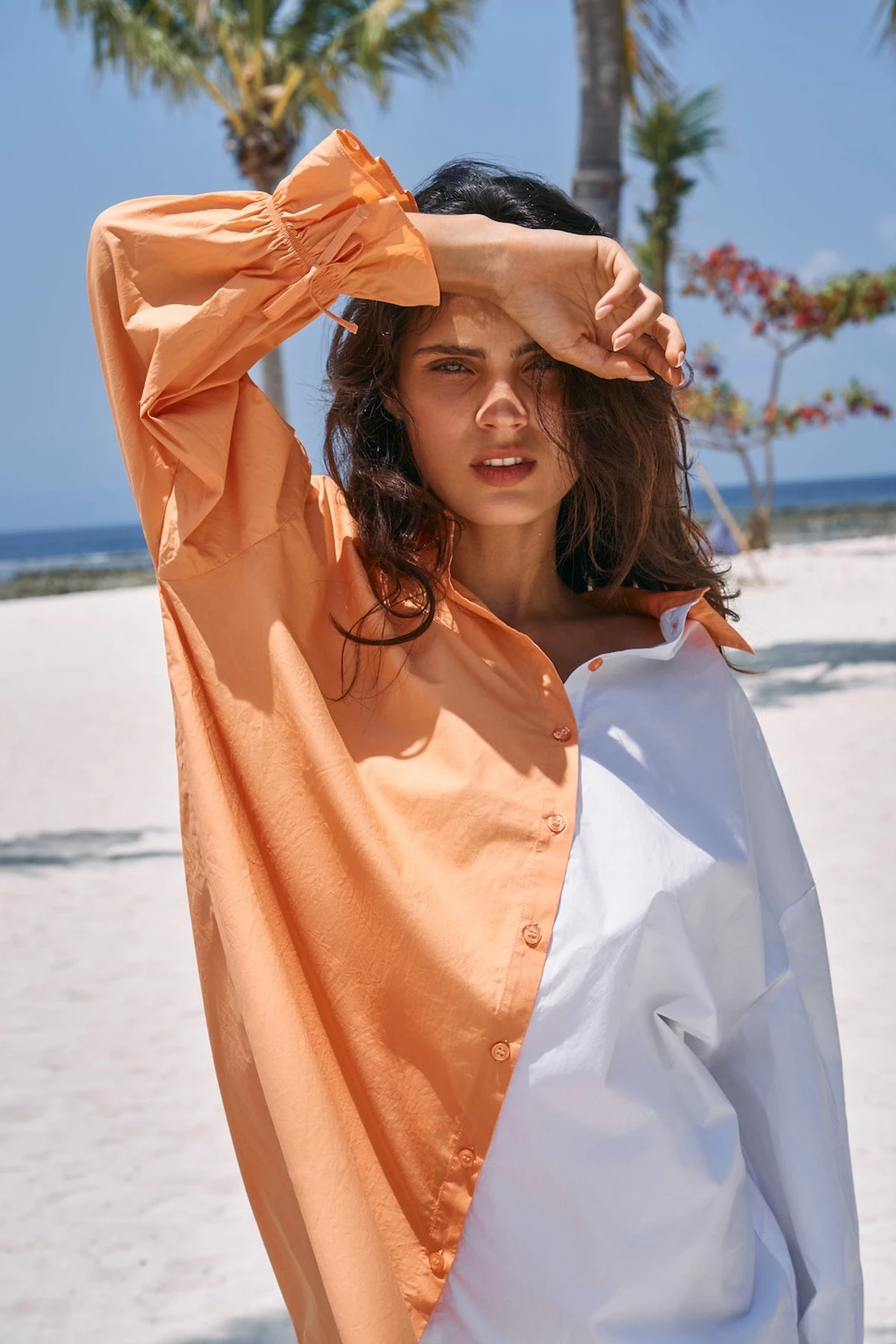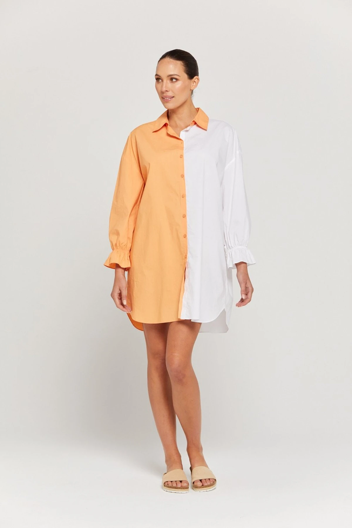 The Kaisley Dress in 100% Cotton Poplin is the shirt dress with a twist that will be sure to be on high rotation this summer. Featuring two tone colouring in melon and white and elastic tie cuff’s, style me with a heel or slides plus your favourite jewellery for an effortlessly cool look.
