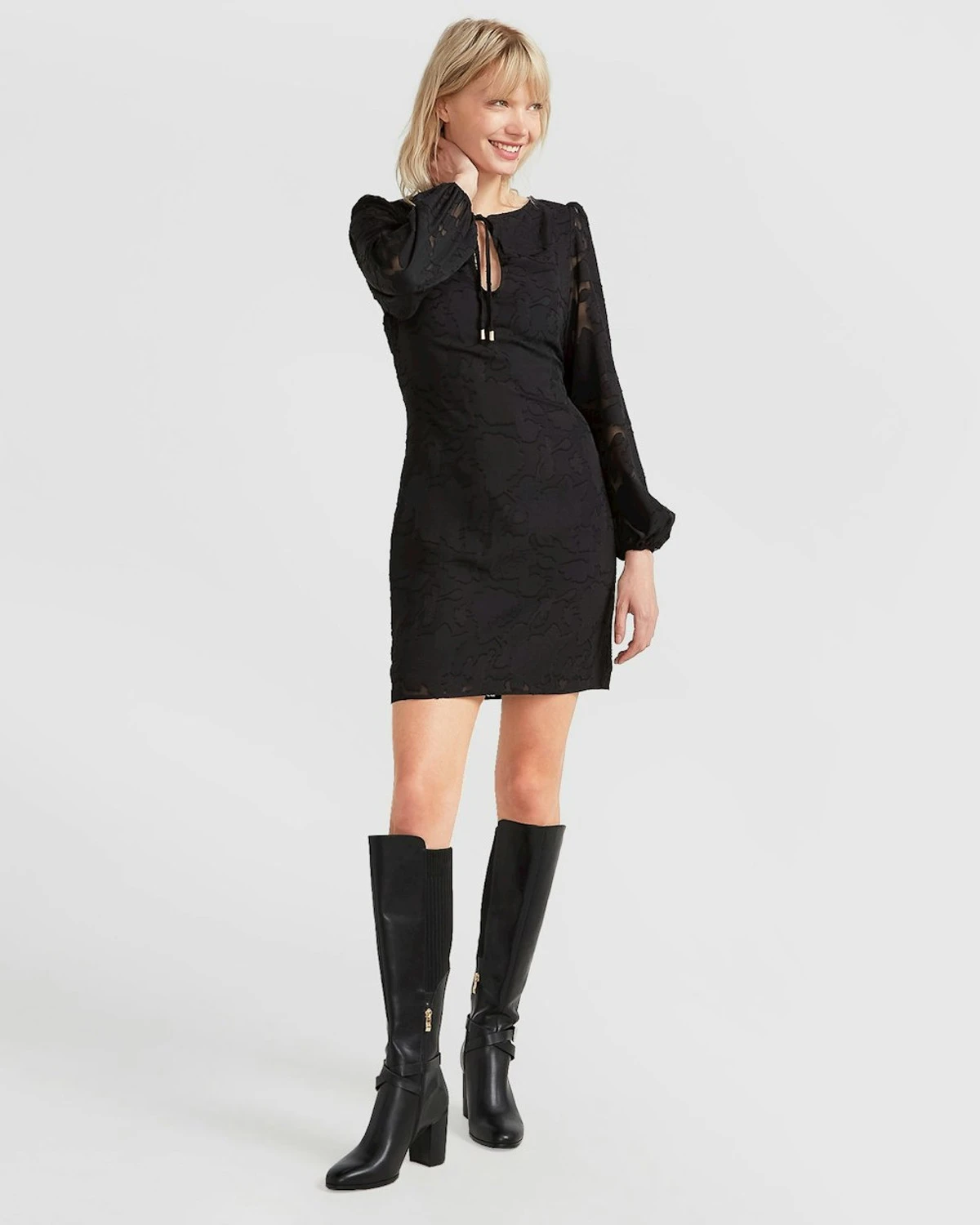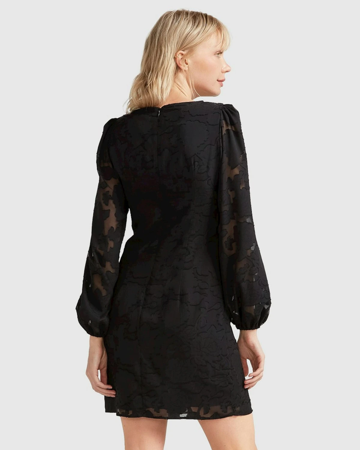Dare to put a little stardust in your wardrobe with this sheer jacquard mini dress. Featuring a flattering, form-fitting silhouette, it’s the sophisticated piece you’ll want to wear every night out in style.