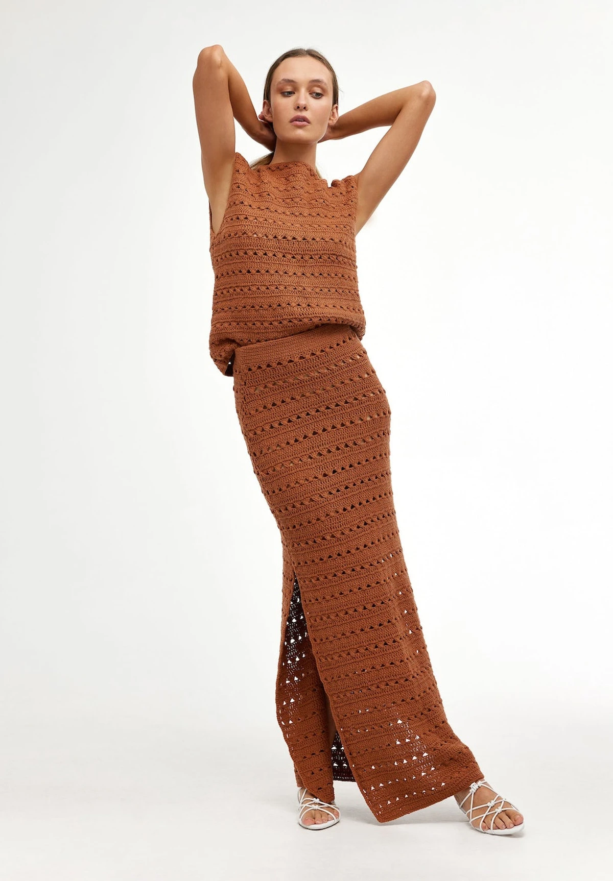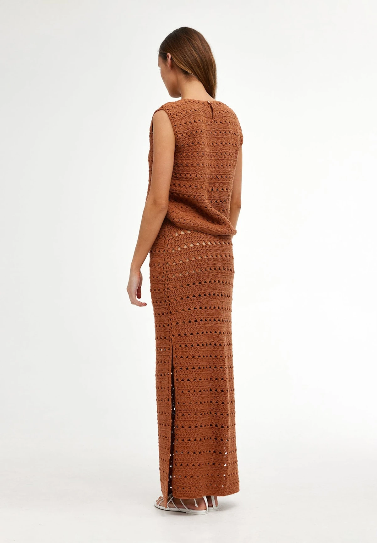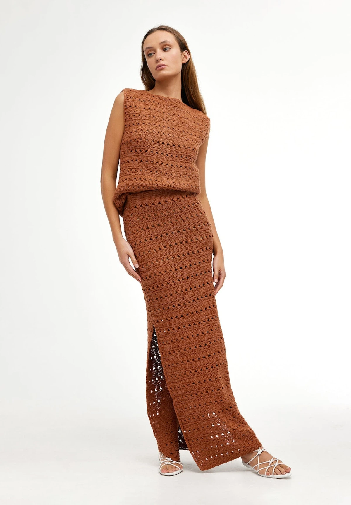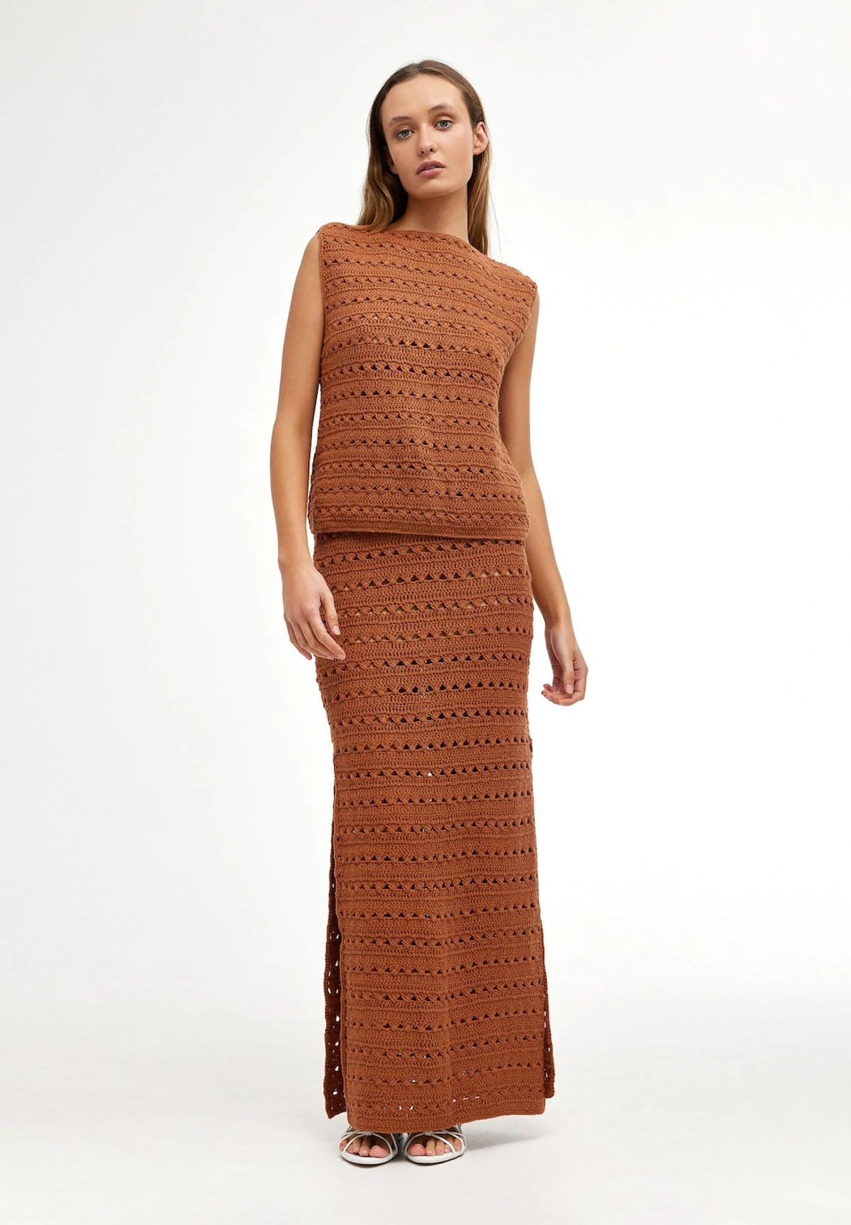 The Laura Skirt in Rust is a straight skirt crafted from a hand crocheted airy 100% cotton yarn. The skirt features a classic straight silhouette with added side vents, an elasticated waistband and a detachable modest slip. Perfect for layering over swimwear or style with the matching Laura Crochet Top for elevated co-ord dressing to take you from day to night.