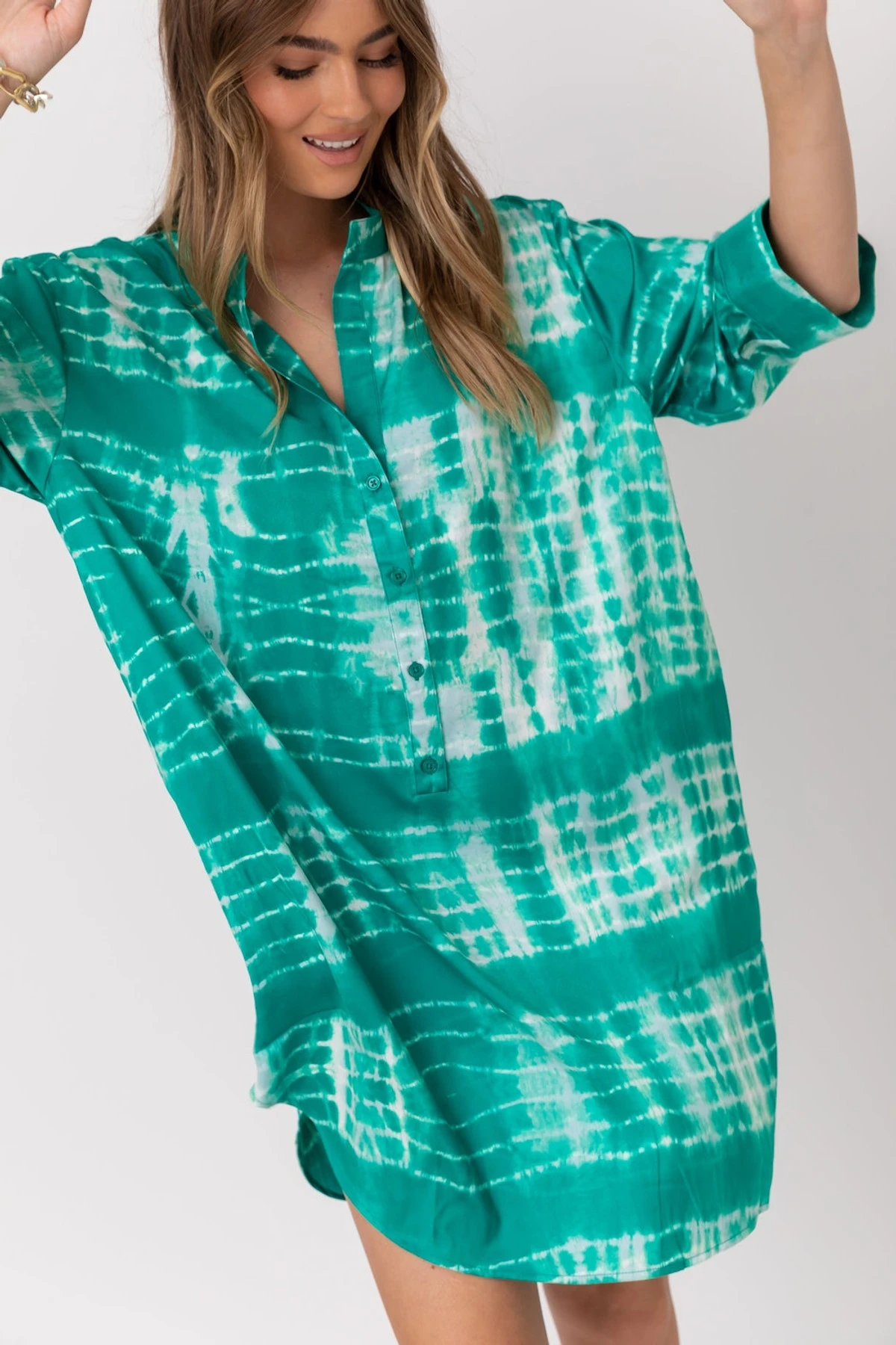 Exude casual sexiness and fun with the LOGAN dress. It is a relaxed shirt-style dress with a fun tie-dye-like print. The green hue, along with a value-down front, mandarin collar, and scooped hems, lend a sultry touch to your laidback casual look. Don it with sneakers for days off or with white pump stilettos for a sexier look.