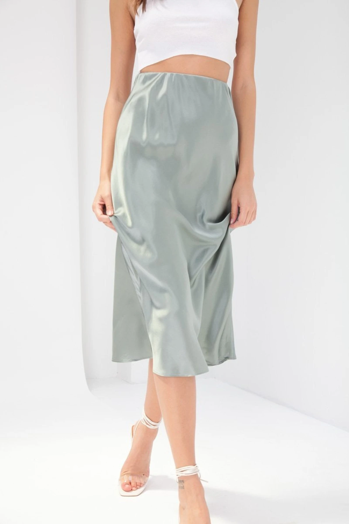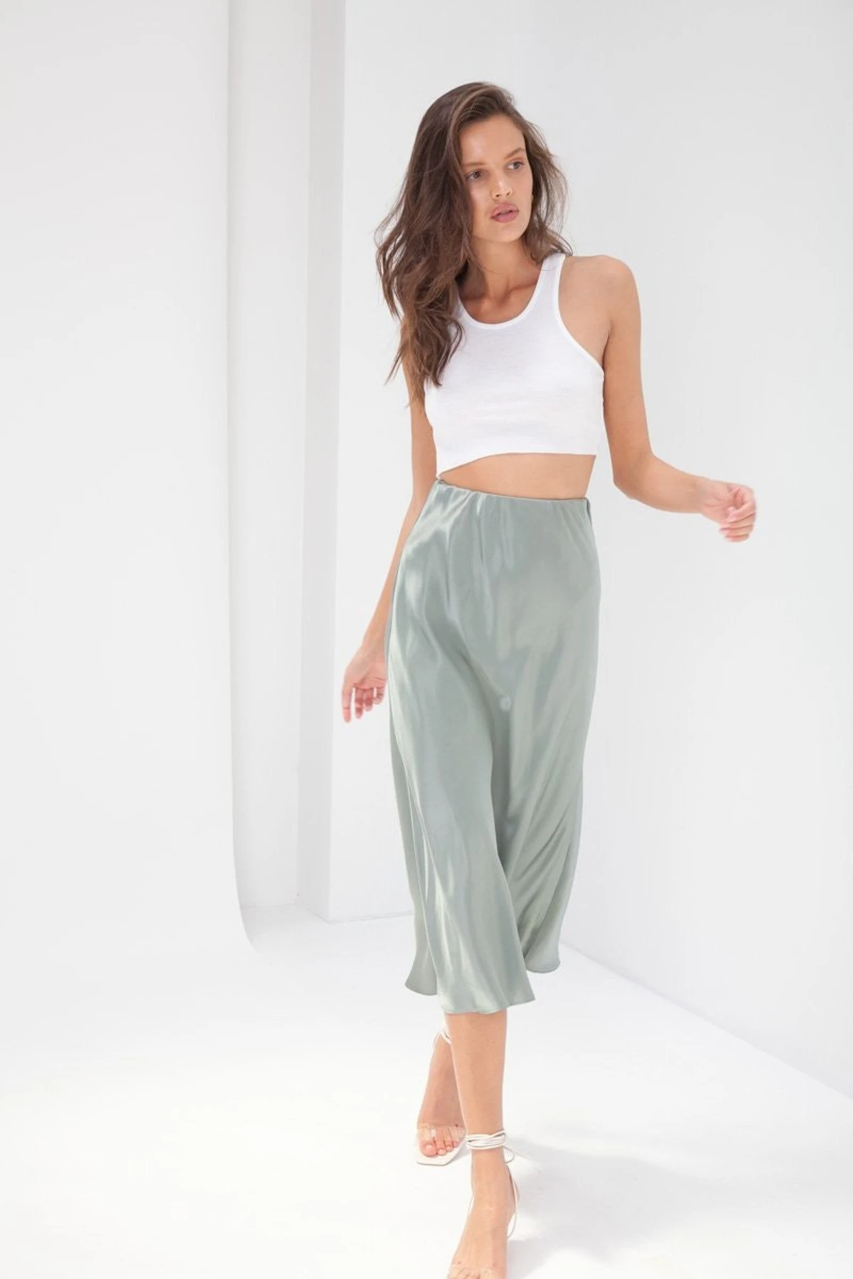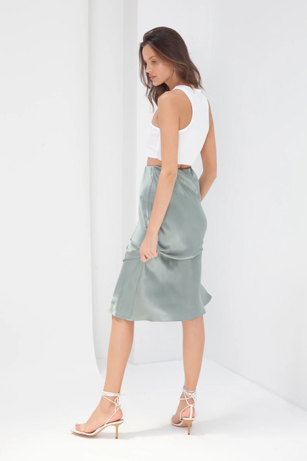 A wardrobe necessity, the Madeline Skirt sits high waisted with an elasticised waist. Featuring an A-line shape with bias-cut midi and a silky finish. Dress down with a tee & sneakers.