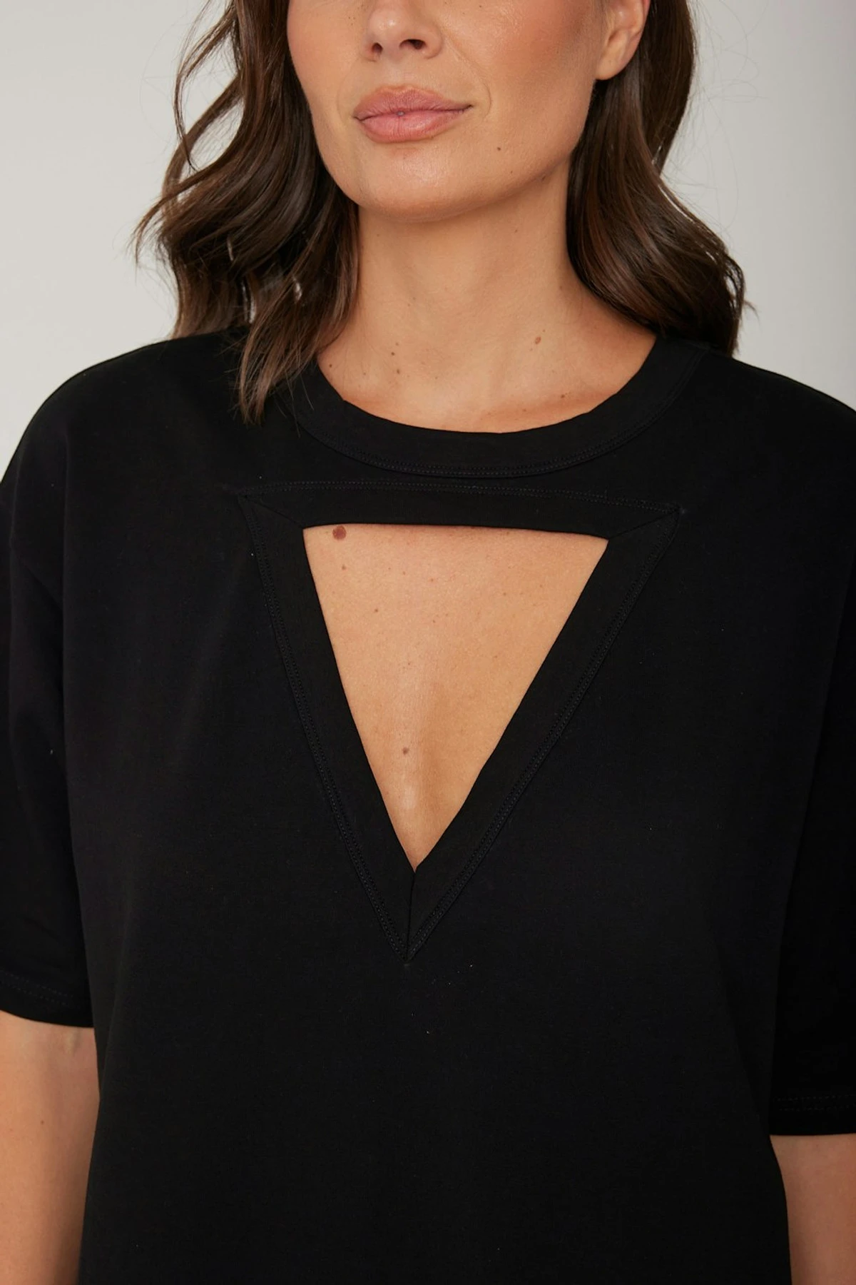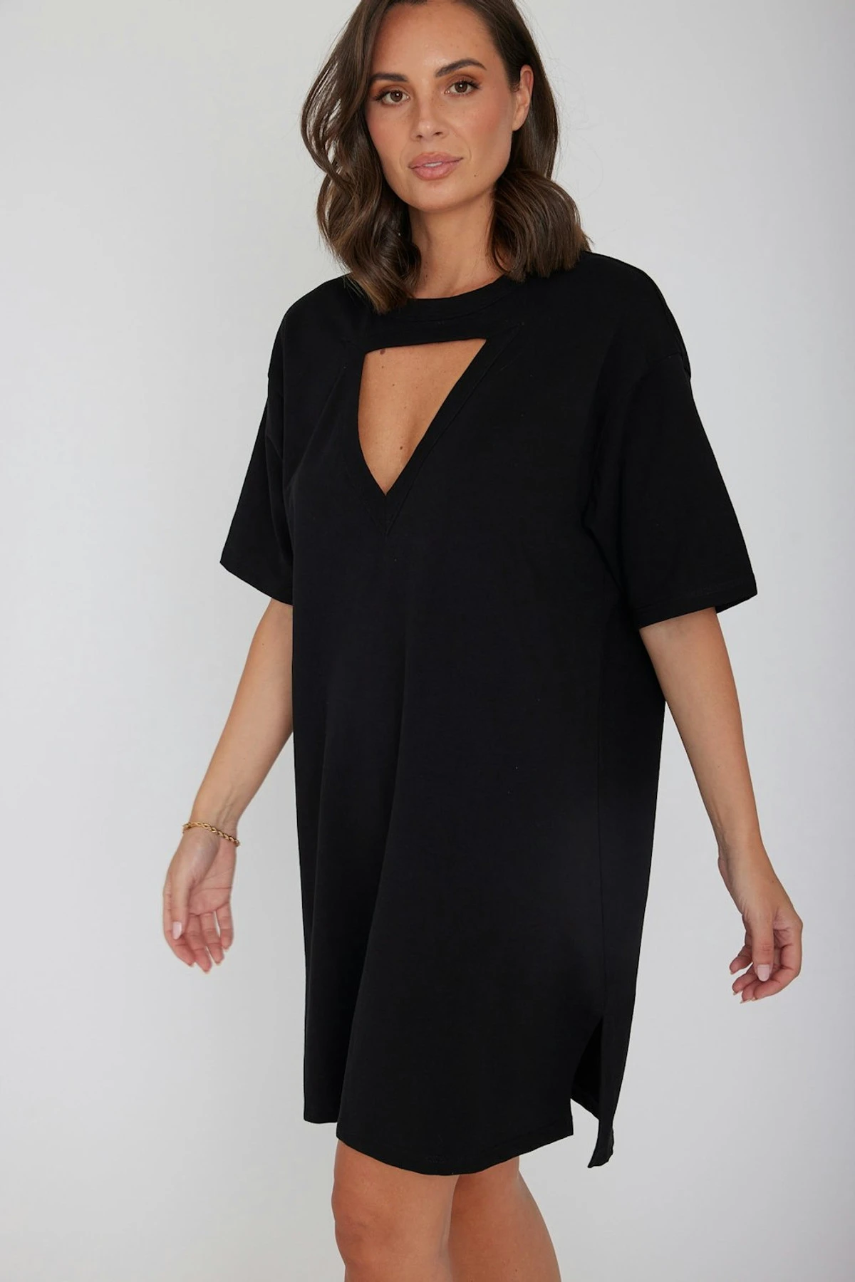 If you love a good statement piece, the MARCUS mini dress in Black can provide just that. A triangle chest cutout adds fun to the plain shirtdress silhouette, while a dual side slit and mini dress design keep you feeling comfortable and feeling sexy.
