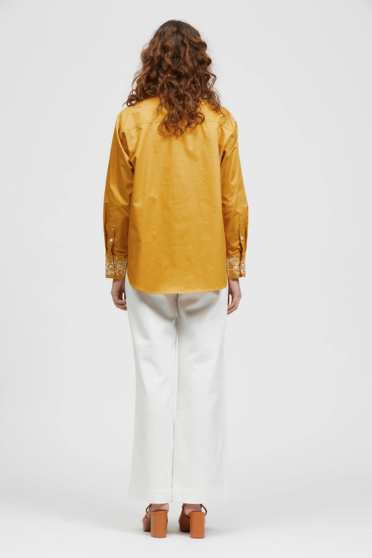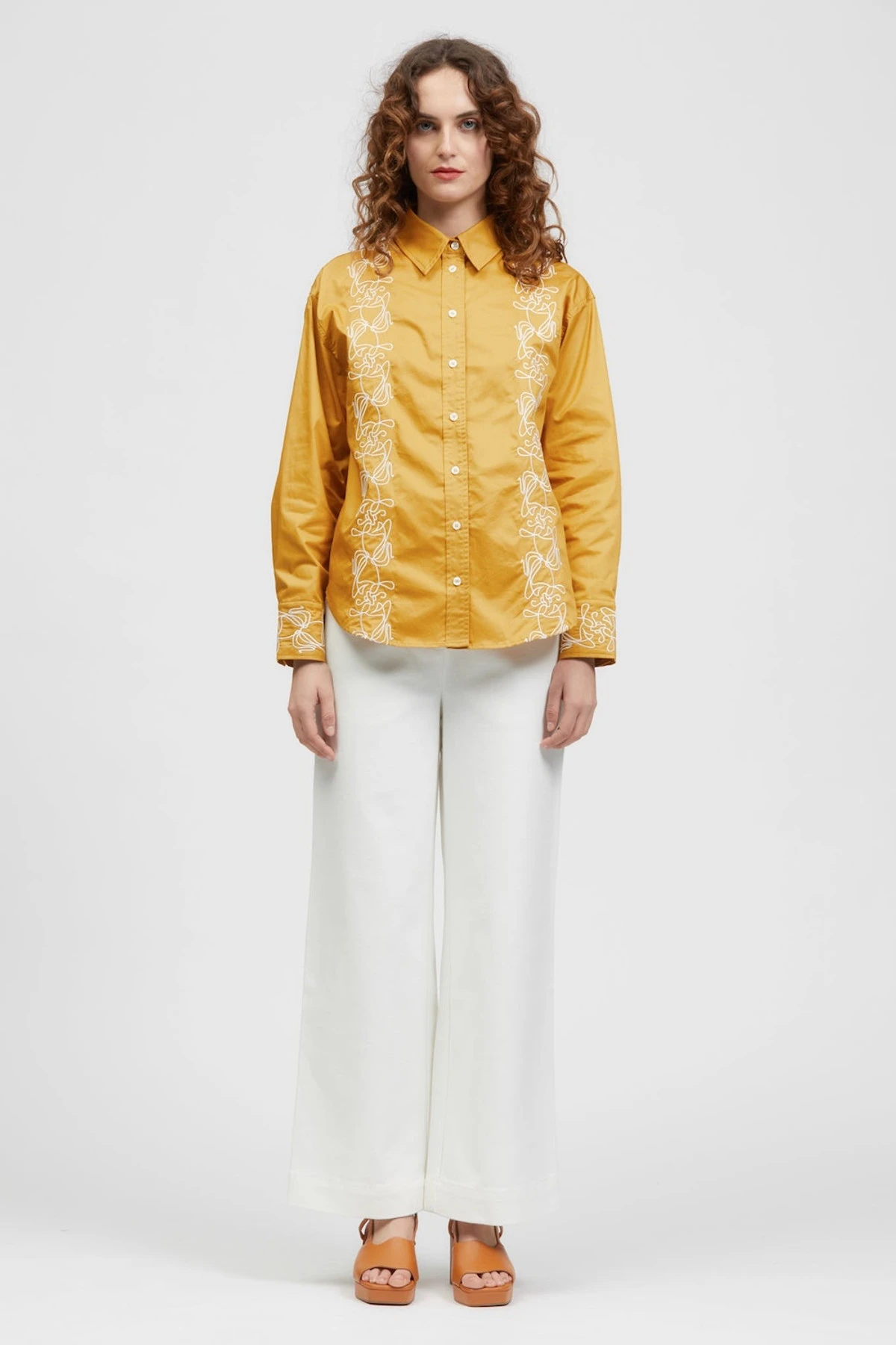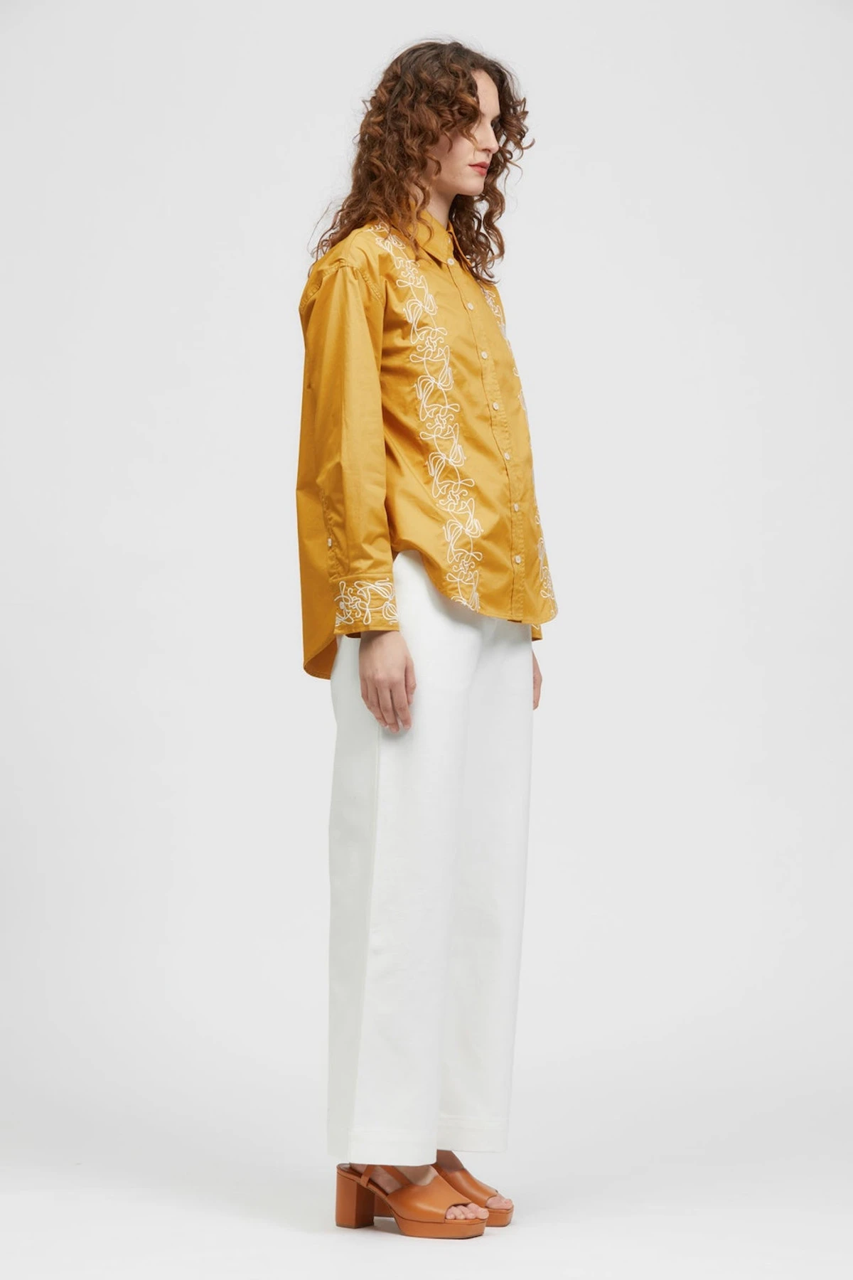 The Meru Oversize Shirt is a classic value-up shirt style with contrast cream embroidery. Búl’s house-designed embroidery runs from each shoulder to the front hems and around the cuffs. This style includes contrast cream values along the centre front placket and cuff. This style offers a classic style collar, back yoke, sleeve pleats and deeply curved hems. Made in a crisp Cotton fabrication.