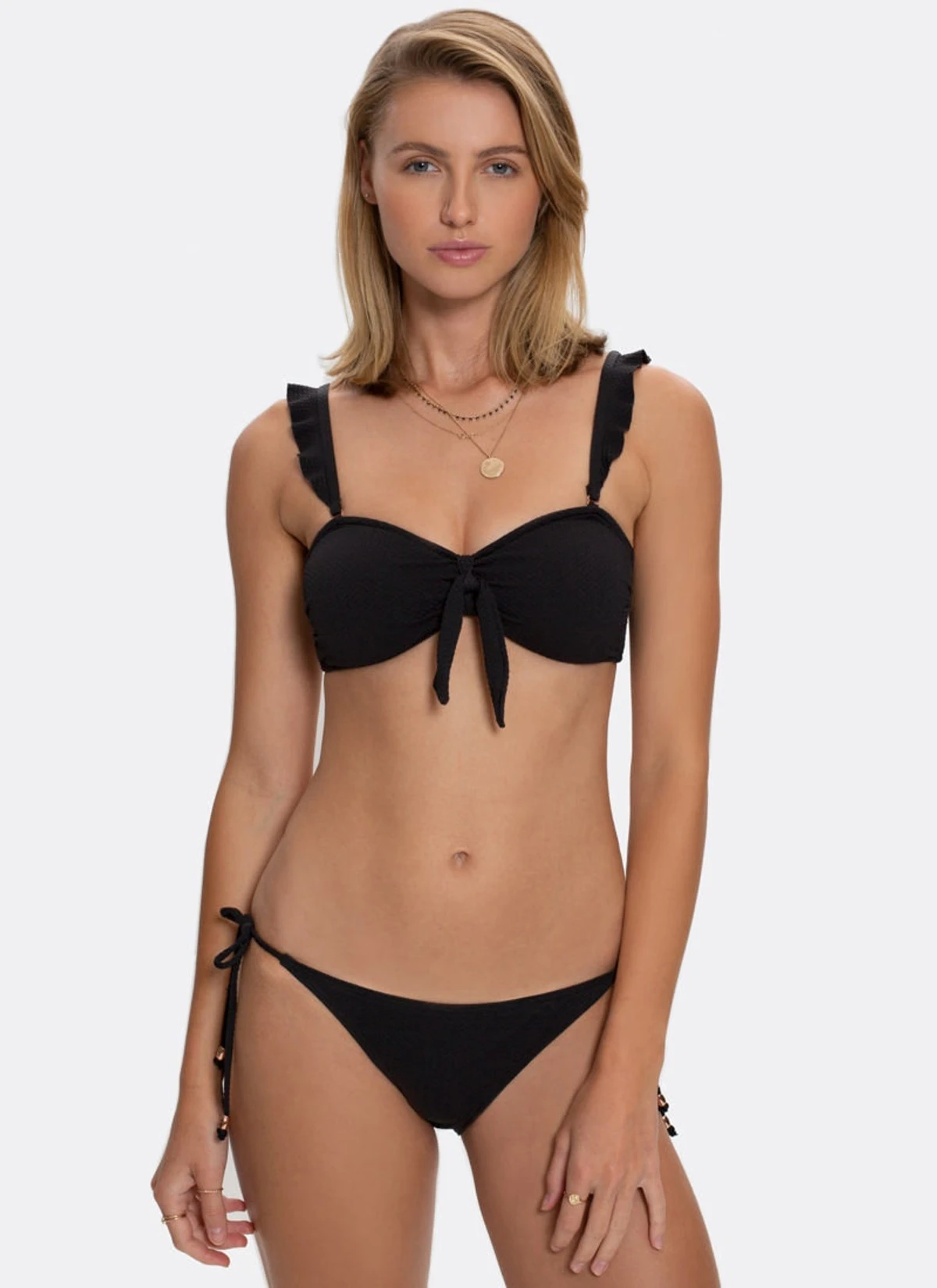 Made from recycled textured jacquard fabric, the Sienna Bandeau is the ultimate bikini top featuring a feminine silhouette, frill shoulder straps and faux tie front style.