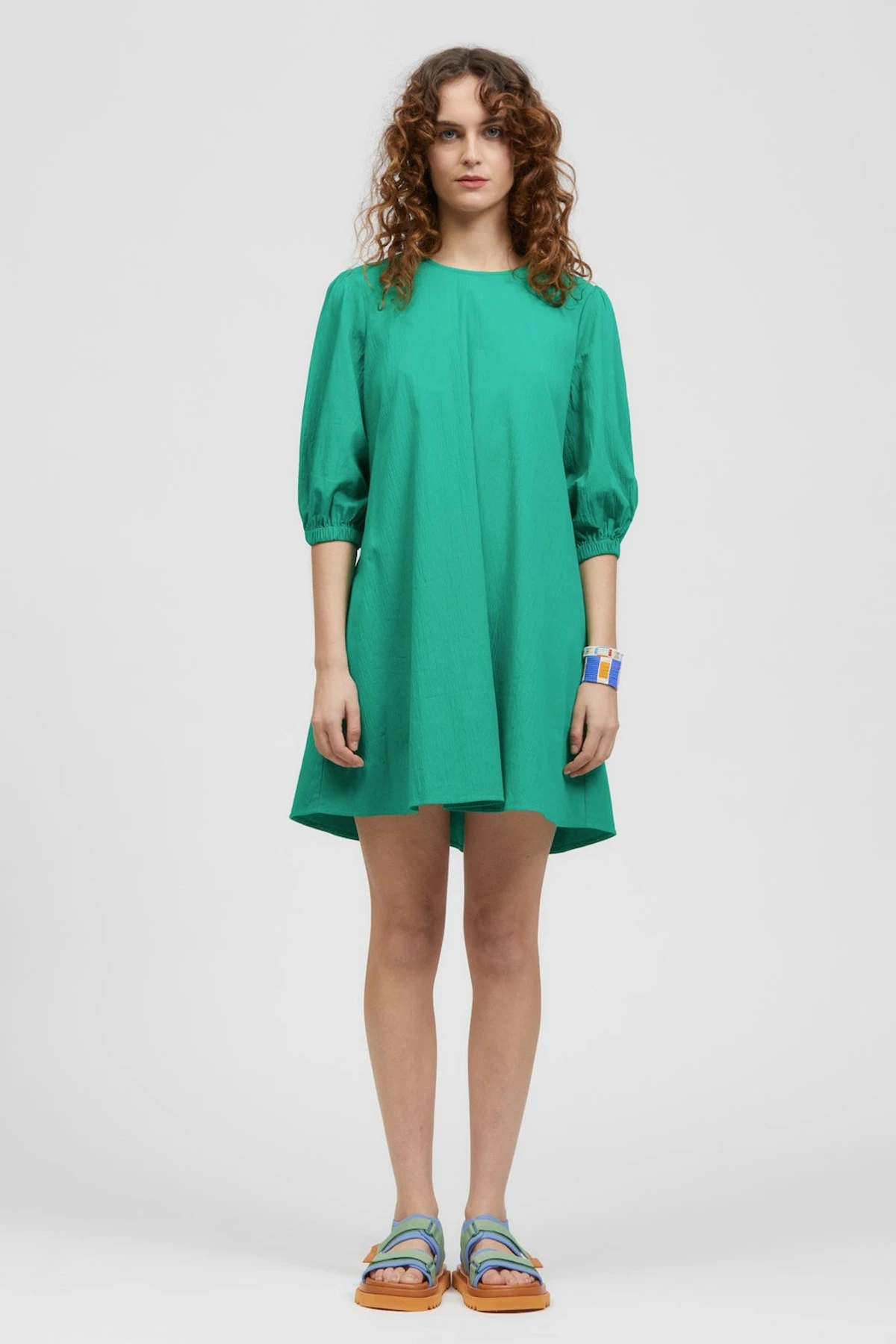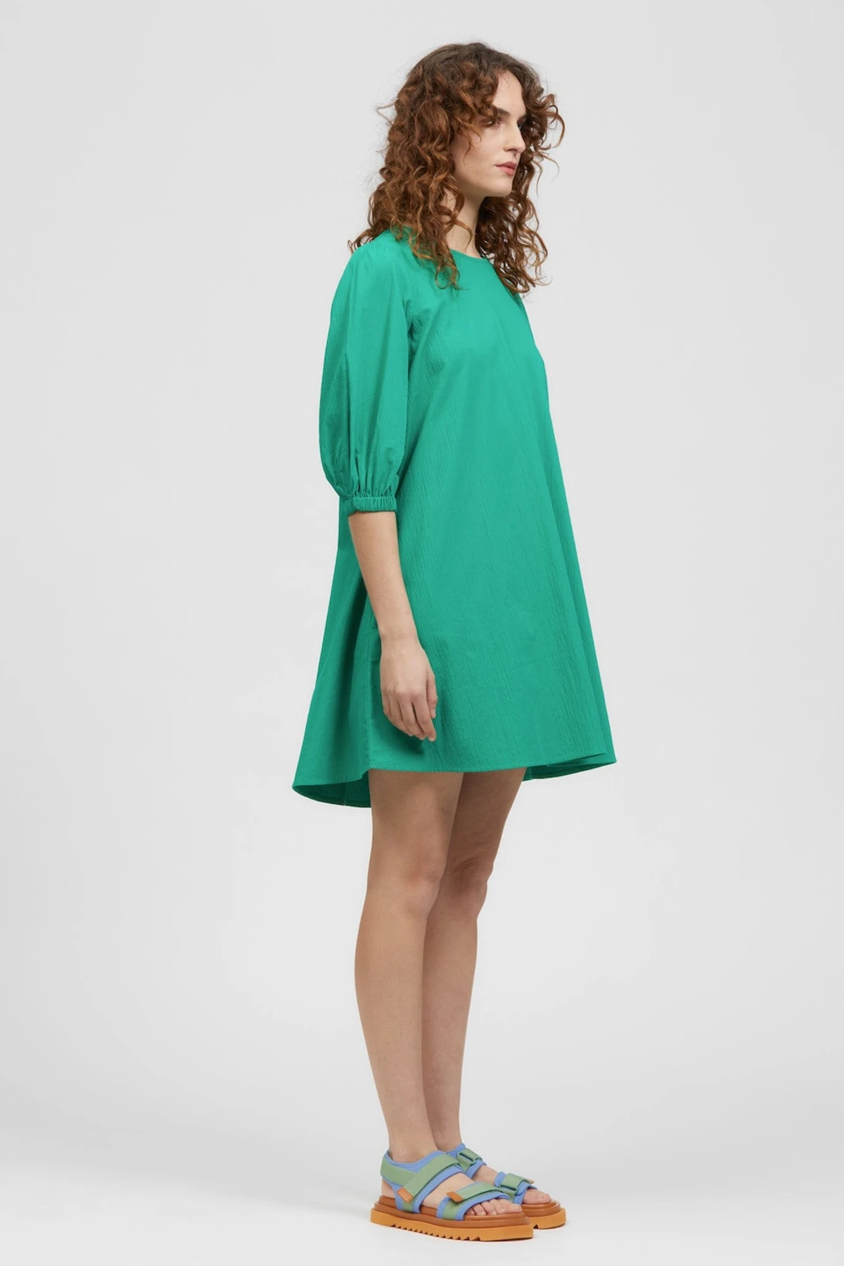 The Sealers Dress is an a-line, mini-length, shift dress with voluminous crop sleeves and elasticated cuffs. This style has marbled shell value fastenings at the back neck and inseam side pockets. Made in a Cotton seersucker fabrication.