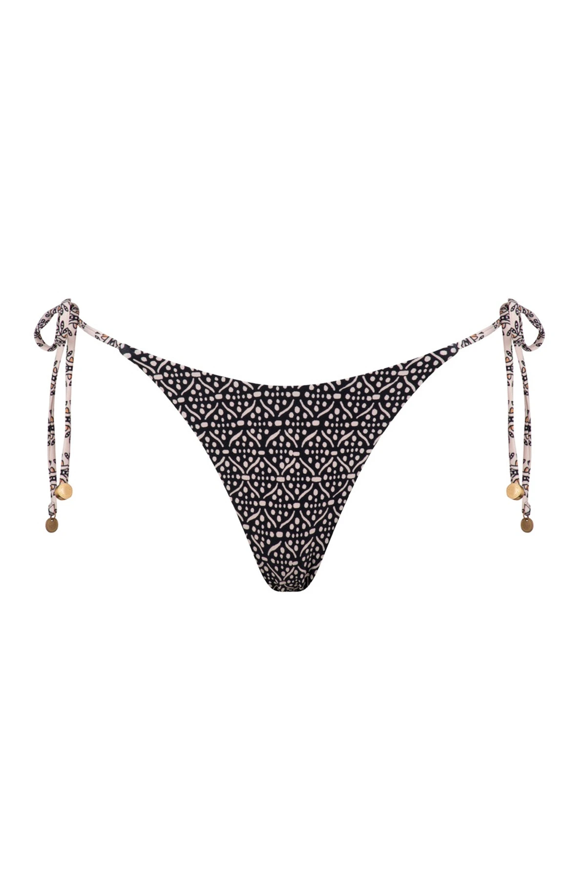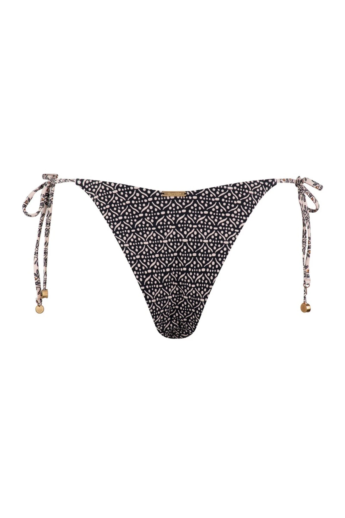 Welcoming Shangri La. Embody a contemporary take on reworked vintage textiles with our flawless batik, block print story. Embrace effortless versatility through classic shapes in soft crinkles and modal crepes. A moody, bold palette to embrace the new season. A favourite style amongst the Tigerlily swim, the Shangri-La High Piper Bottom is a cheeky style, with a flattering high cut and playful tie sides.