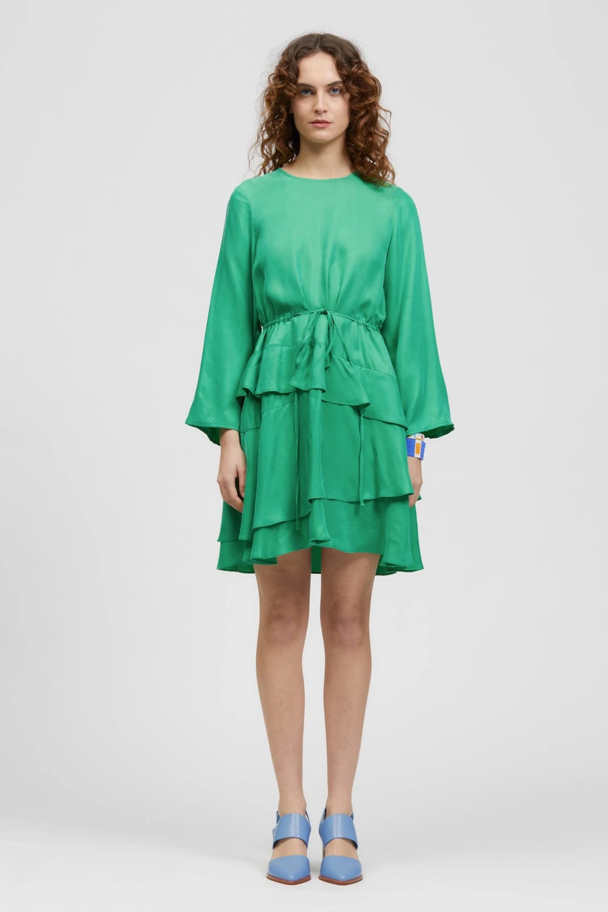 The Tembo Mini Dress is a round-neck mini-length style with wrist-length bell sleeves. This style features a drawstring detail around the waist, offering a soft gathering. The skirt includes asymmetrical frills adding volume towards the hem. This style includes an asymmetrical back keyhole detail with a self-covered value at the back neck. Made in a smooth Cupro/Viscose blend.
