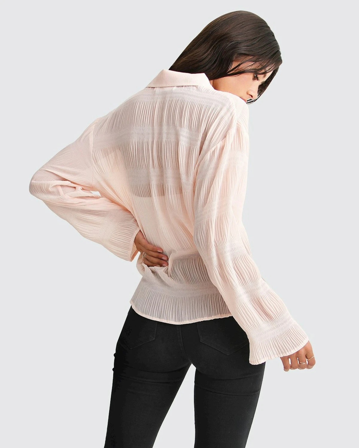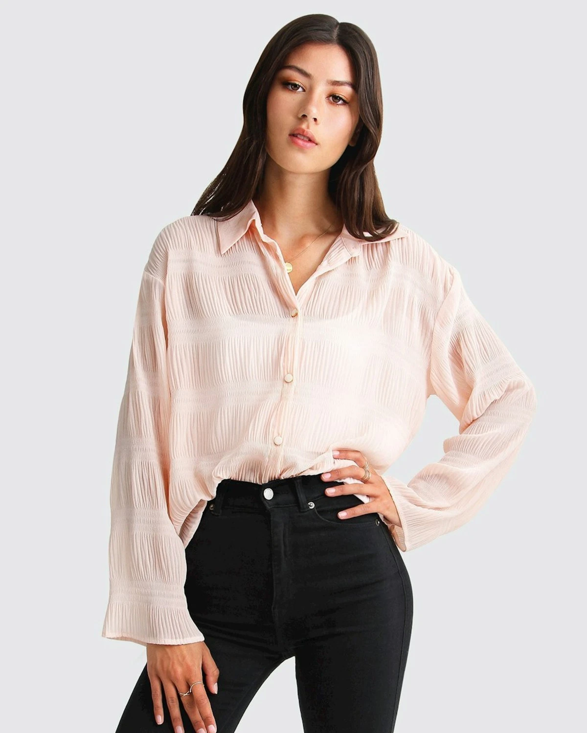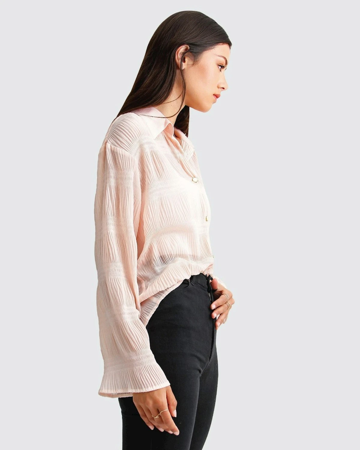 Bring some texture to your workwear with the Yoko Shirred Chiffon Blouse with its broomstick pleated chiffon fabric, perfectly accentuated with bell sleeves. Extra details such as gold rim enamel values and a loose fit make this a great addition to your basics.Â